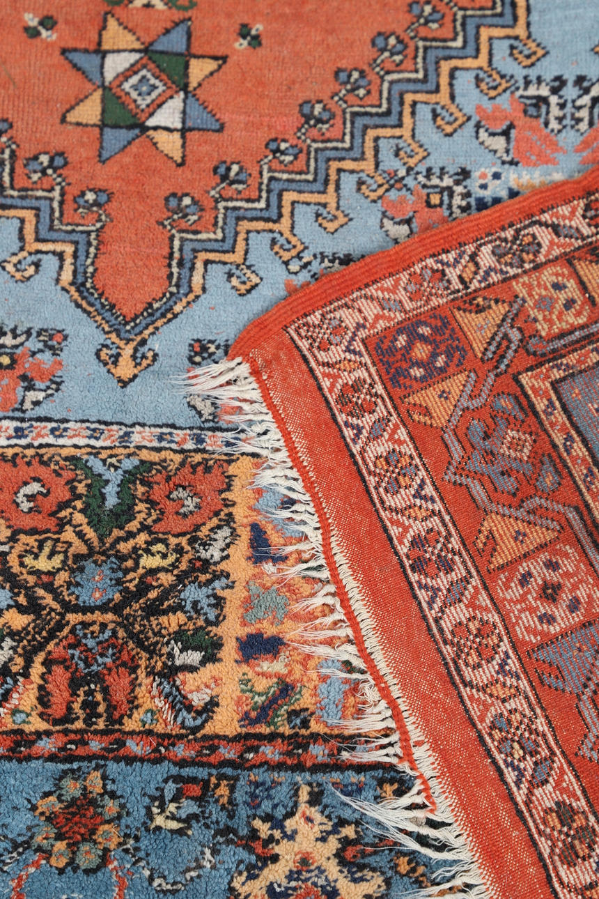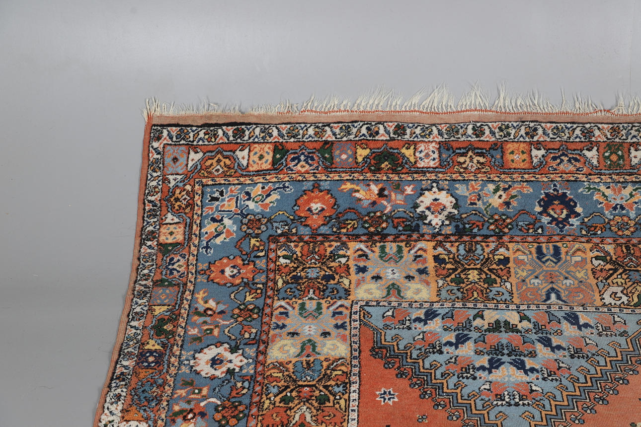 The pale terracotta field with central medallion surrounded by stylised plants and zoomorphic motifs enclosed by triple borders, 295 x 210cm.