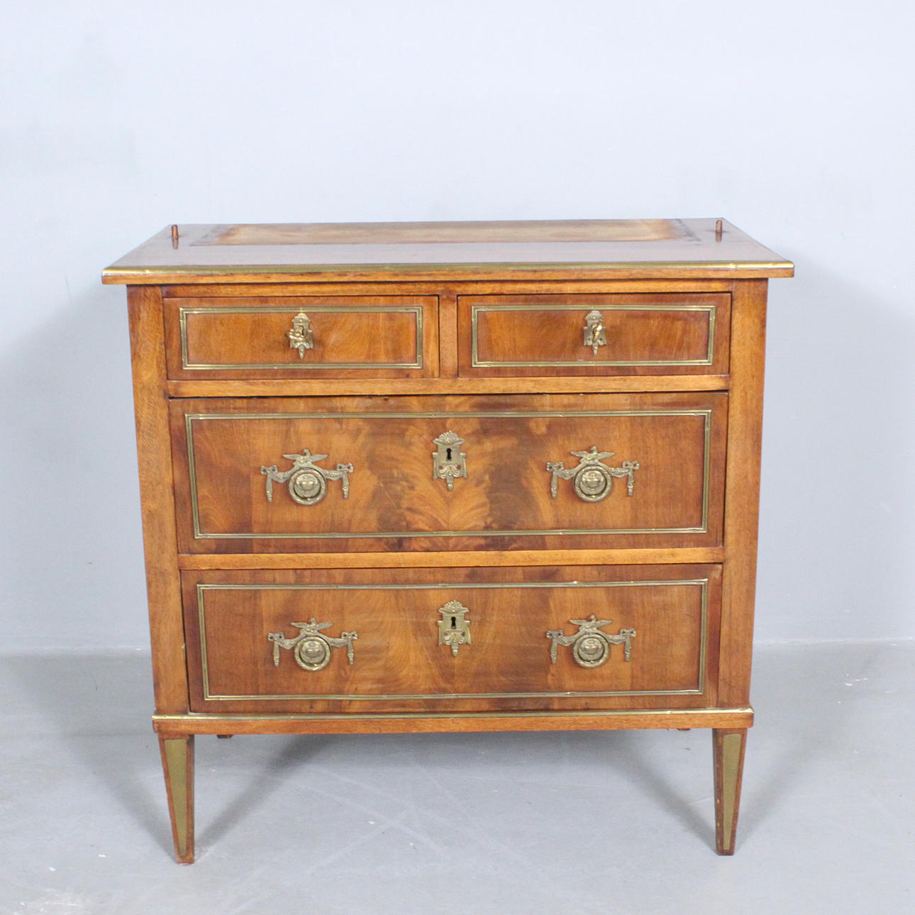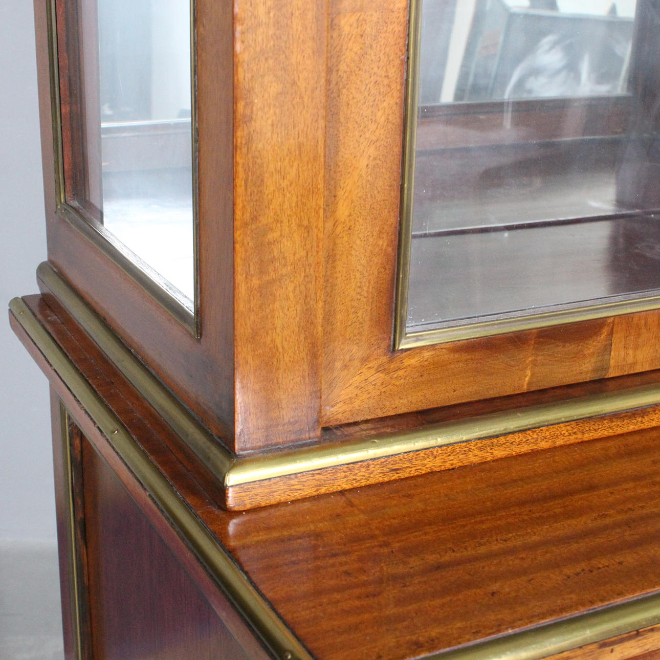 cupboard/display cabinet, equipped with a door and four drawers, with mirror, decorated with brass ornaments, three keys available,