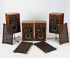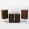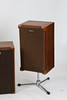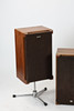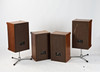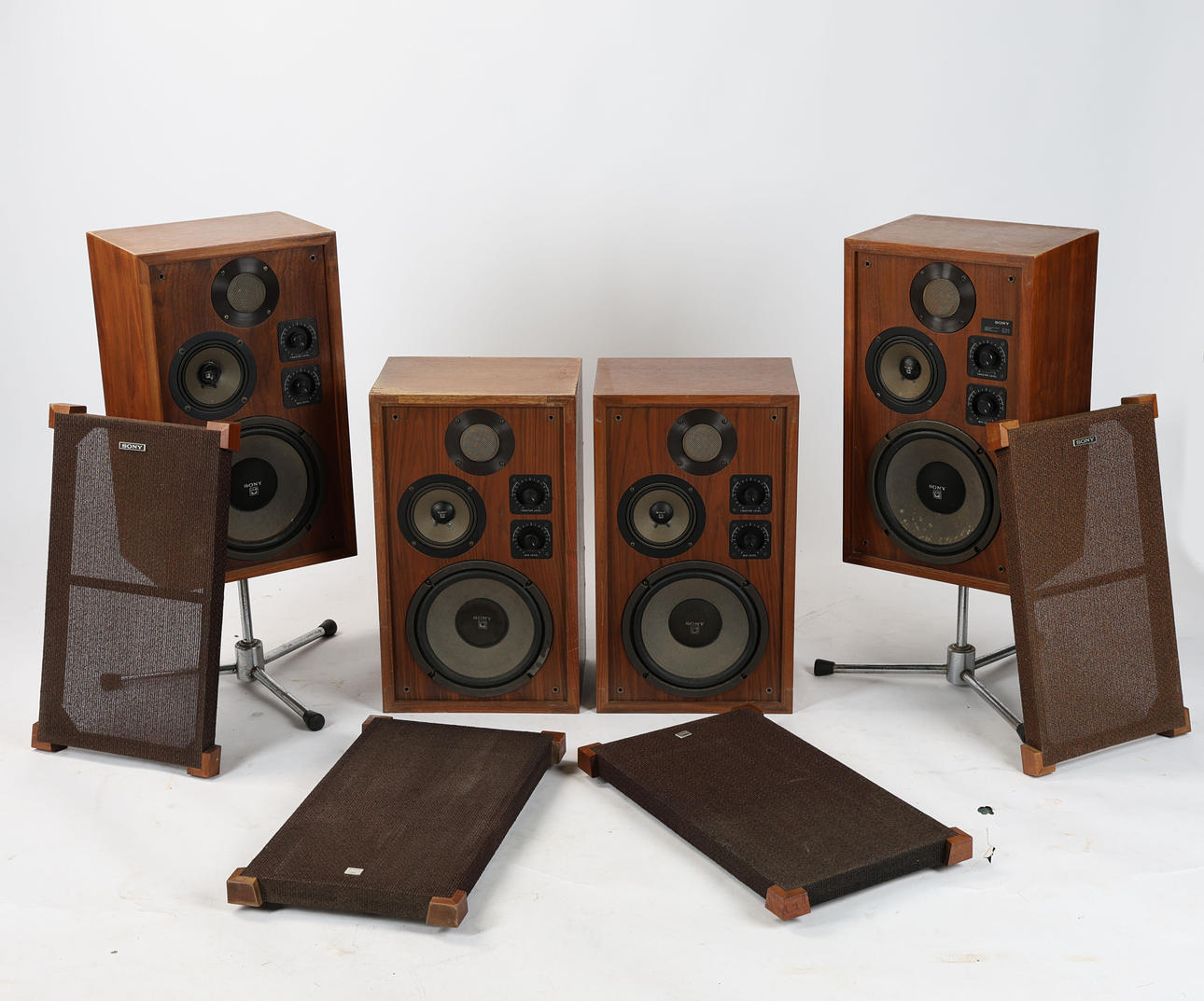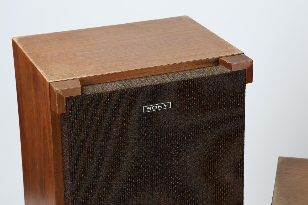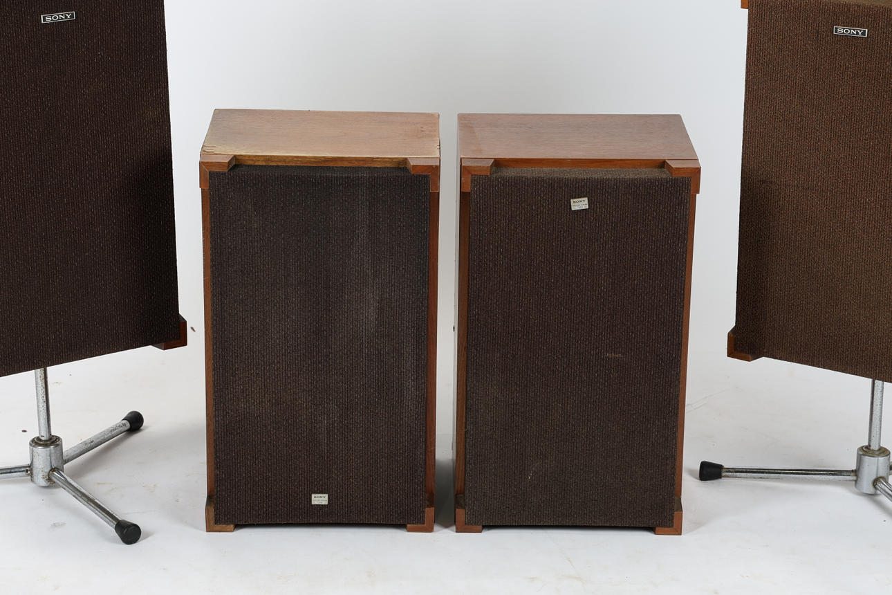 Four SS 7200 loudspeakers by Sony, two of which are on speaker stands, serial numbers rubbed on all but one (#515040), each speaker measuring 59cm x 35cm x 29cm without stands. (4).