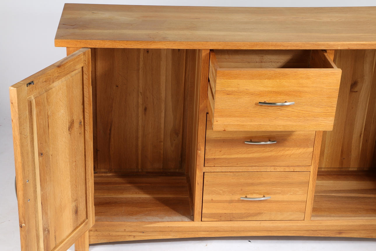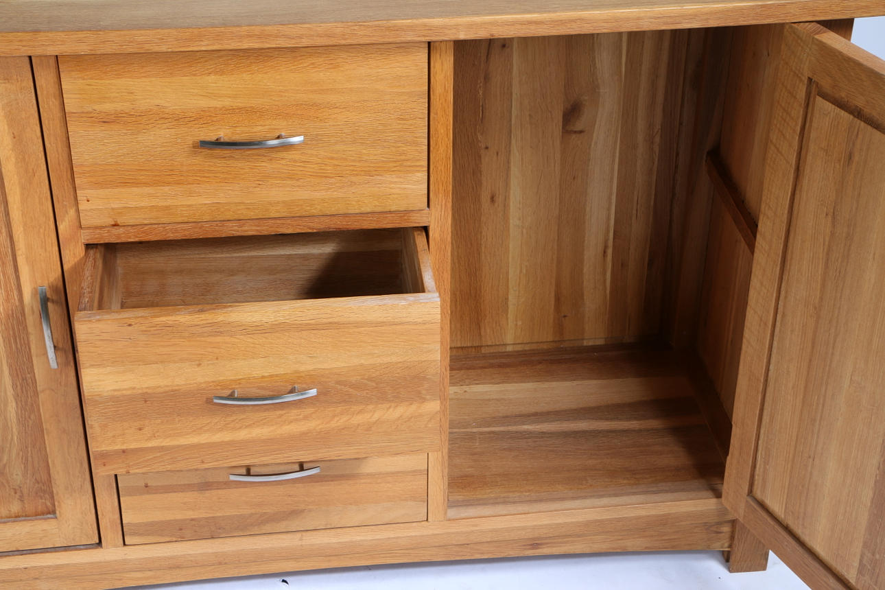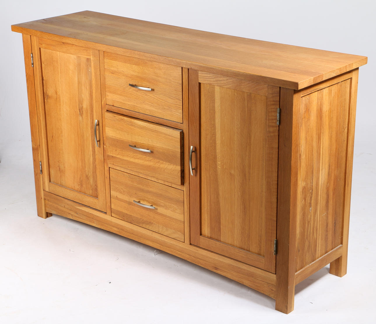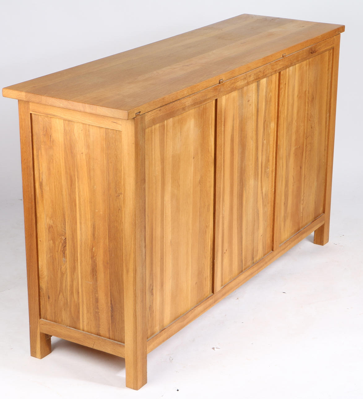 The sideboard by Brooklyn Oiled Oak Furniture, with three central drawers flanked by two cupboard doors, 82cm height, 135cm width, 41cm depth.