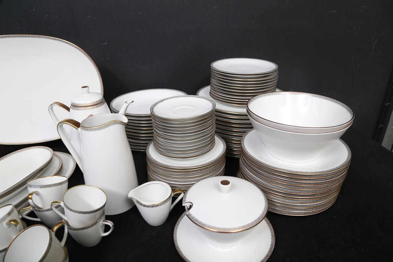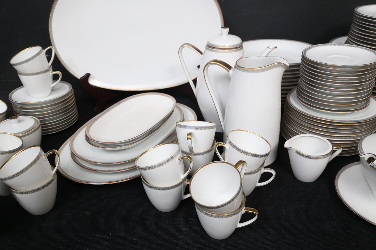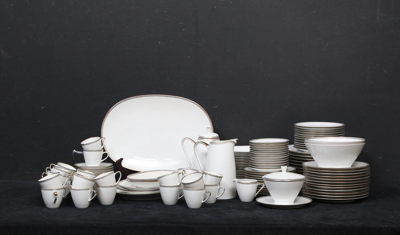 12 dinner plates, 12 deep plates, 12 entrance plates, 23 side dishes, jug, sauce bowl with lid, 6 serving plates, 2 serving bowls, 23 coffee cups with saucer, coffee pot, sugar bowl and cream jug.