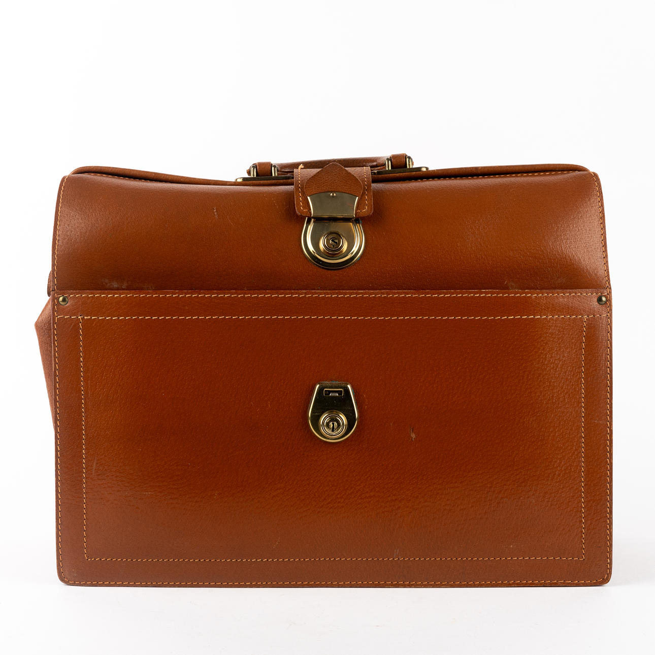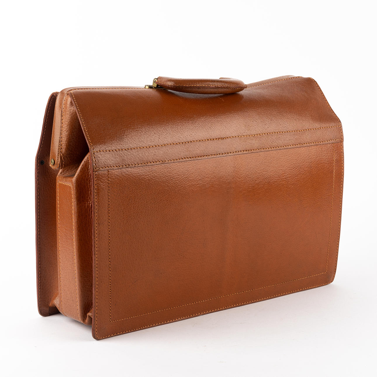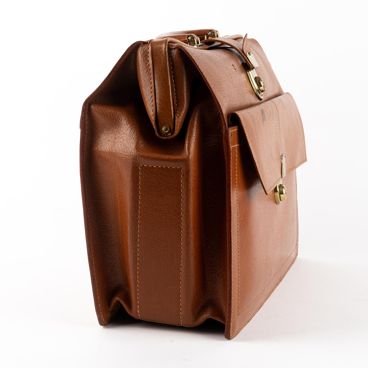 Front with 2 compartments, one lockable. Inside with compartments. Length approx. 43,5 height 32 and depth 16 cm.