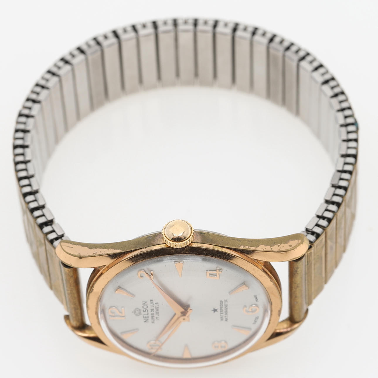 Steel. It's manual. Diameter excluding crown about 33 mm. Between the horns 42 mm.