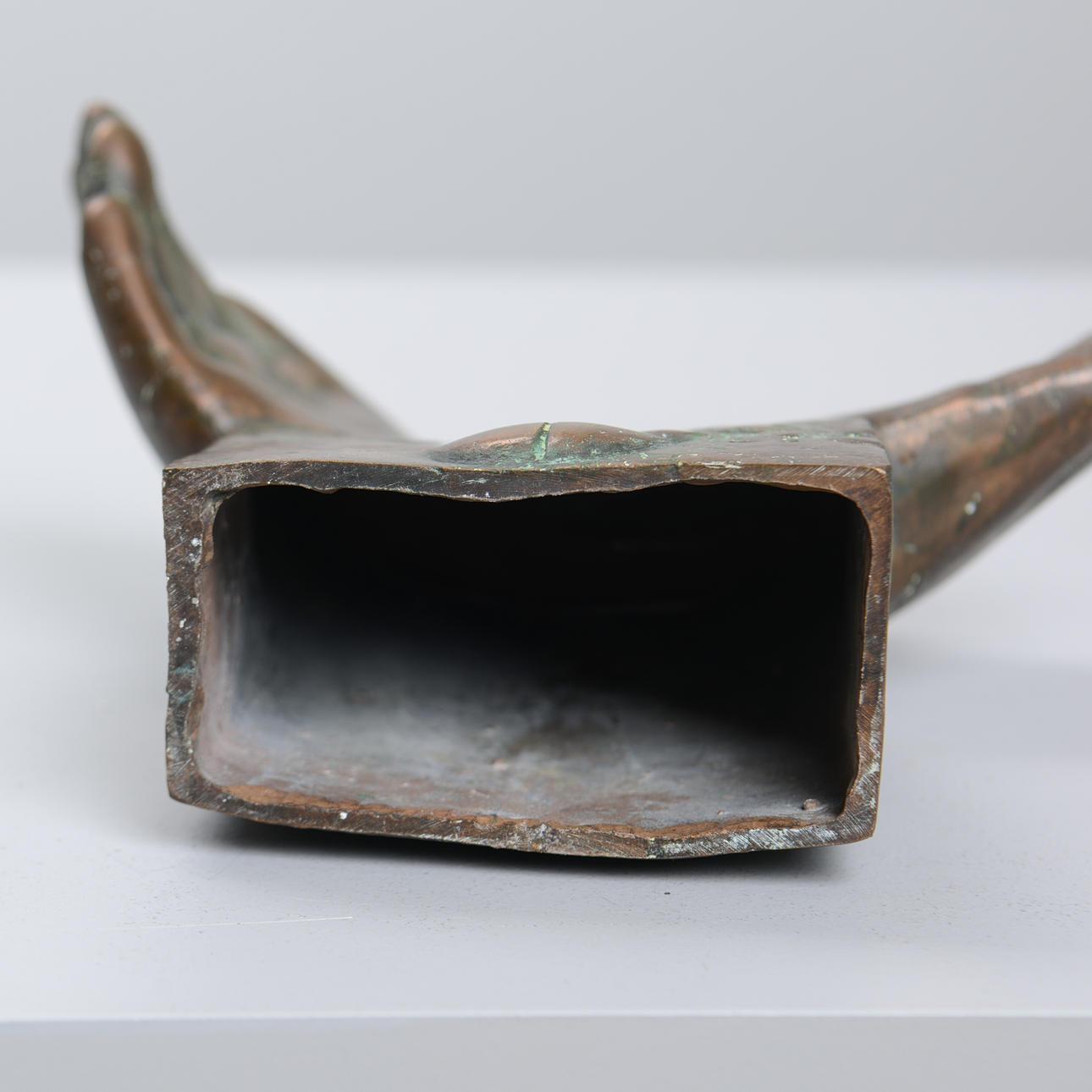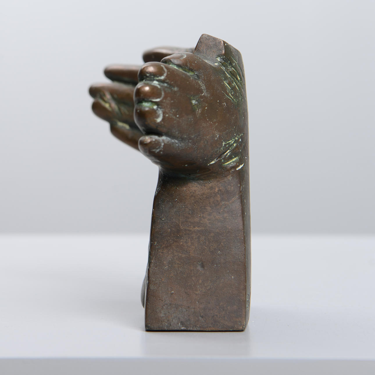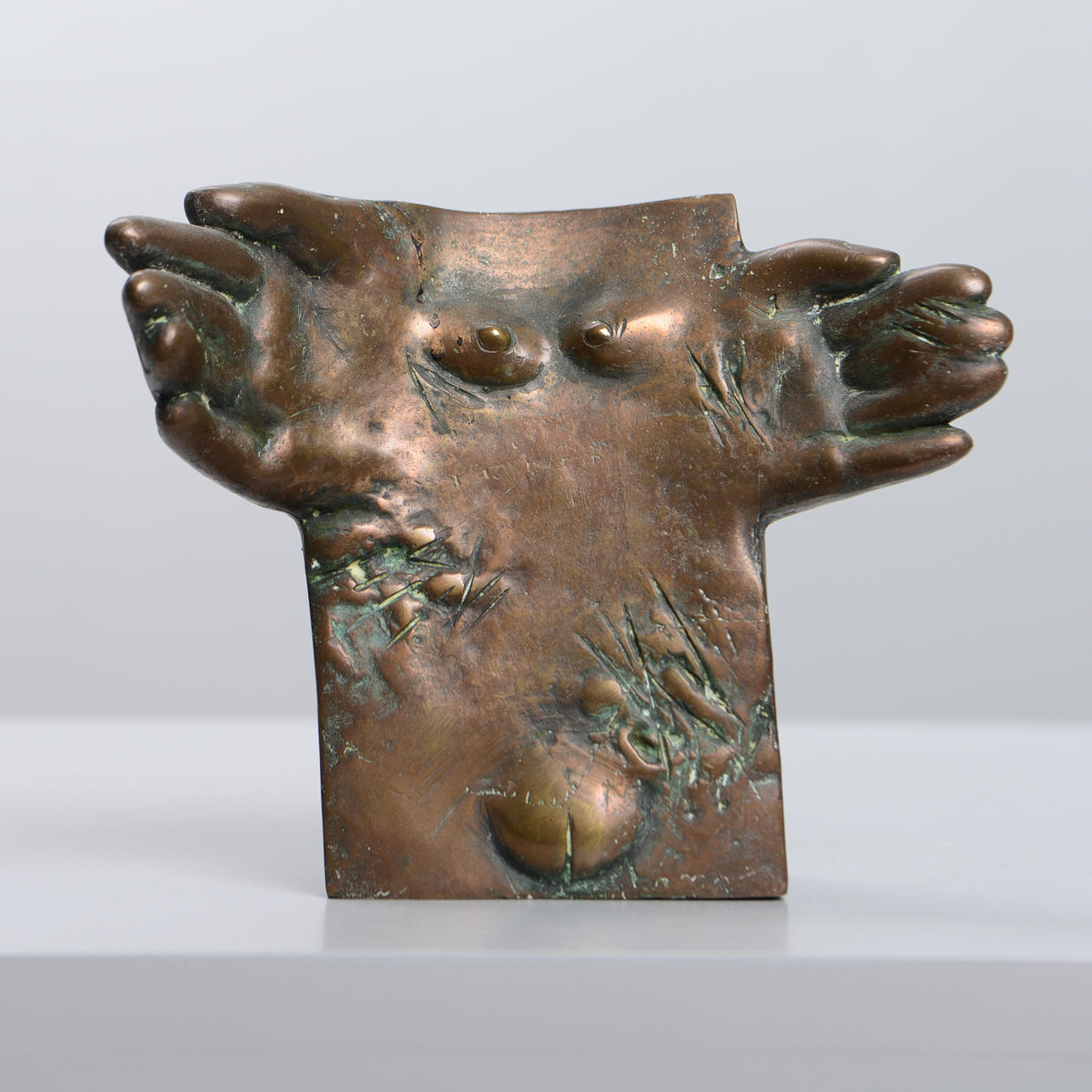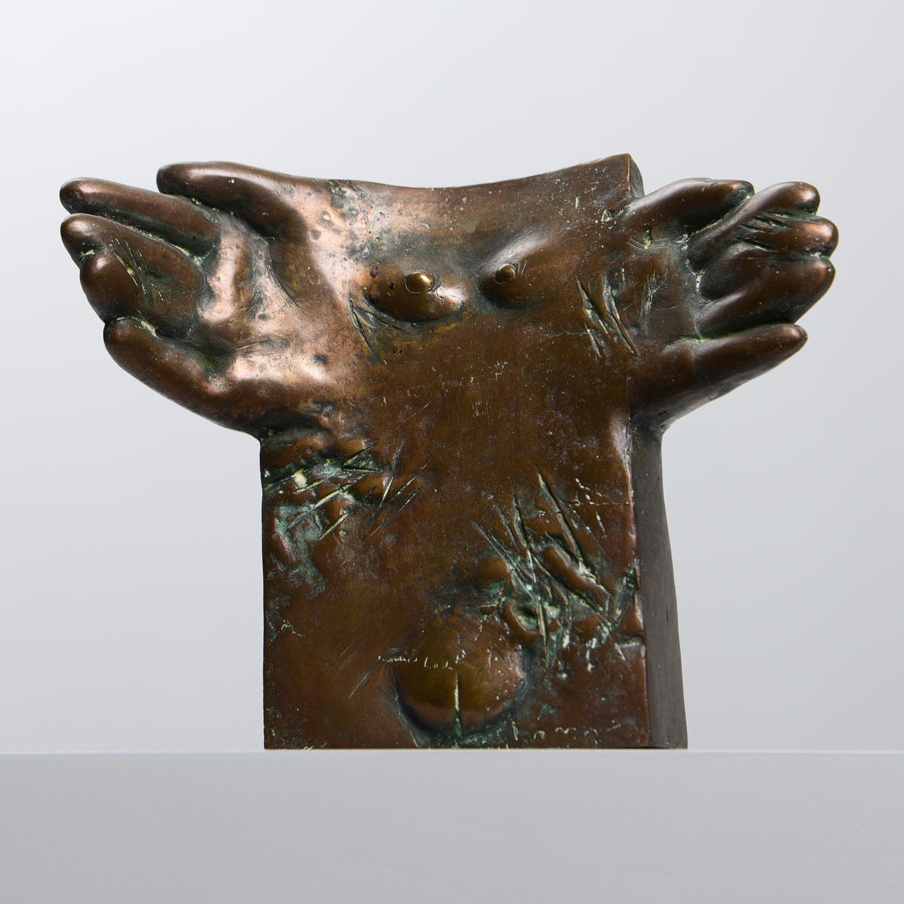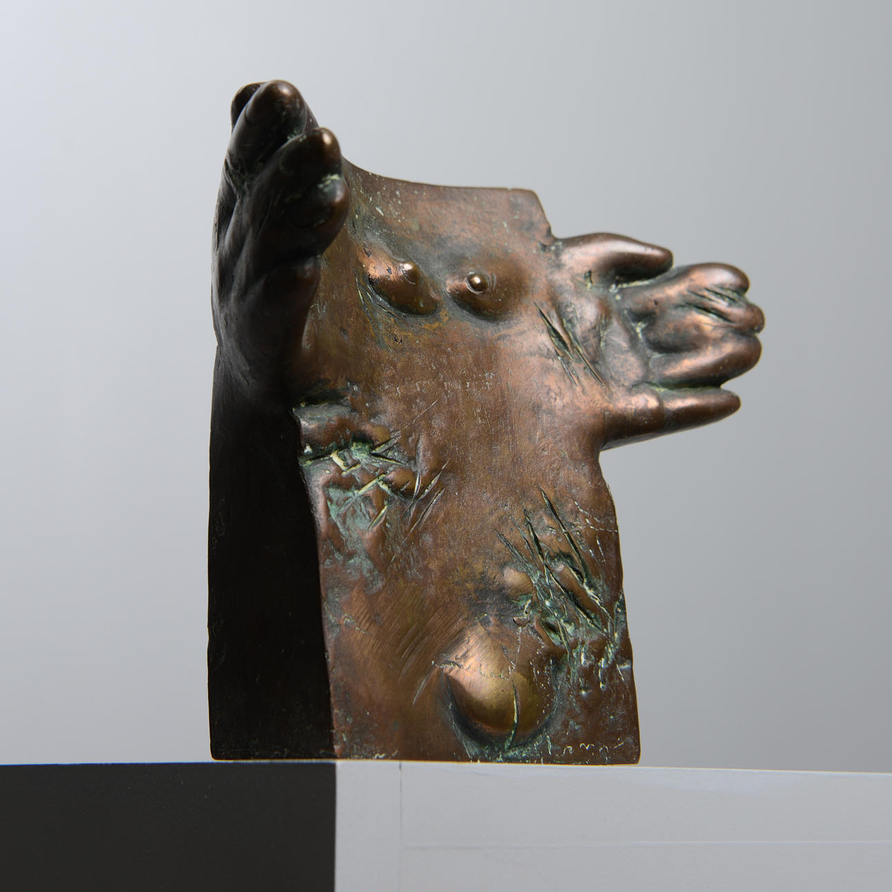 Surreal composition with embraced hands and chest.