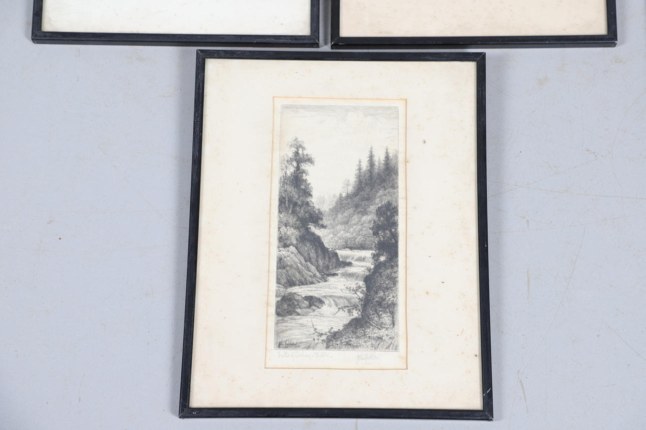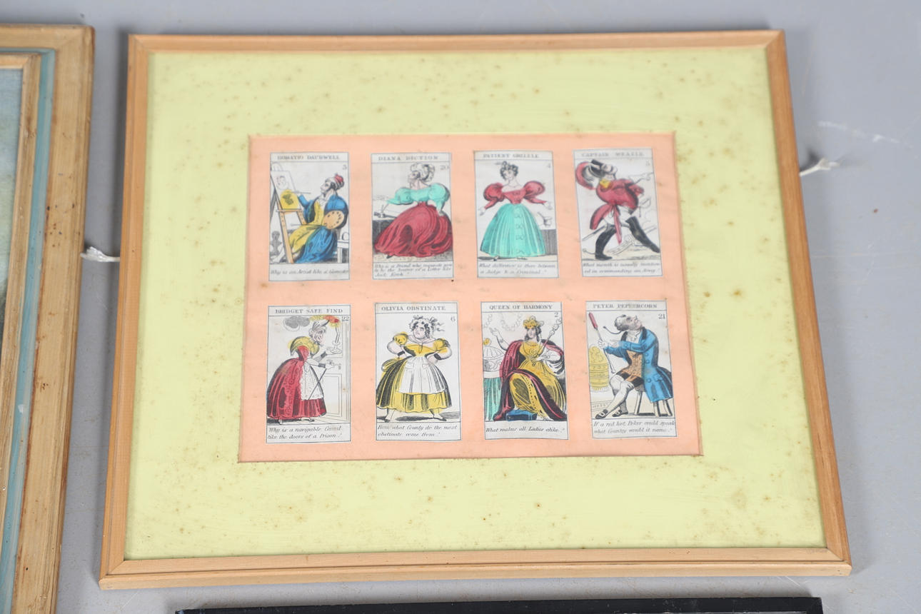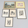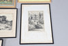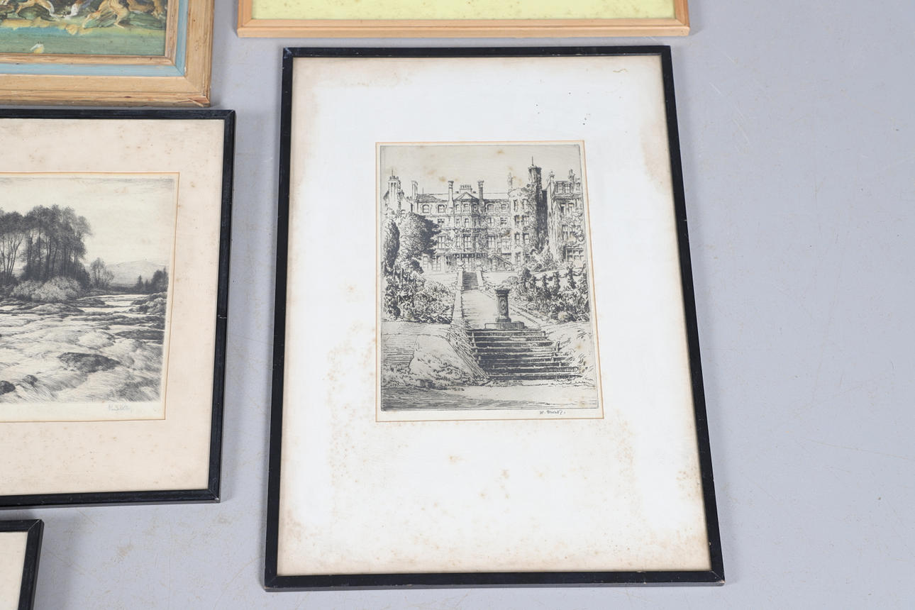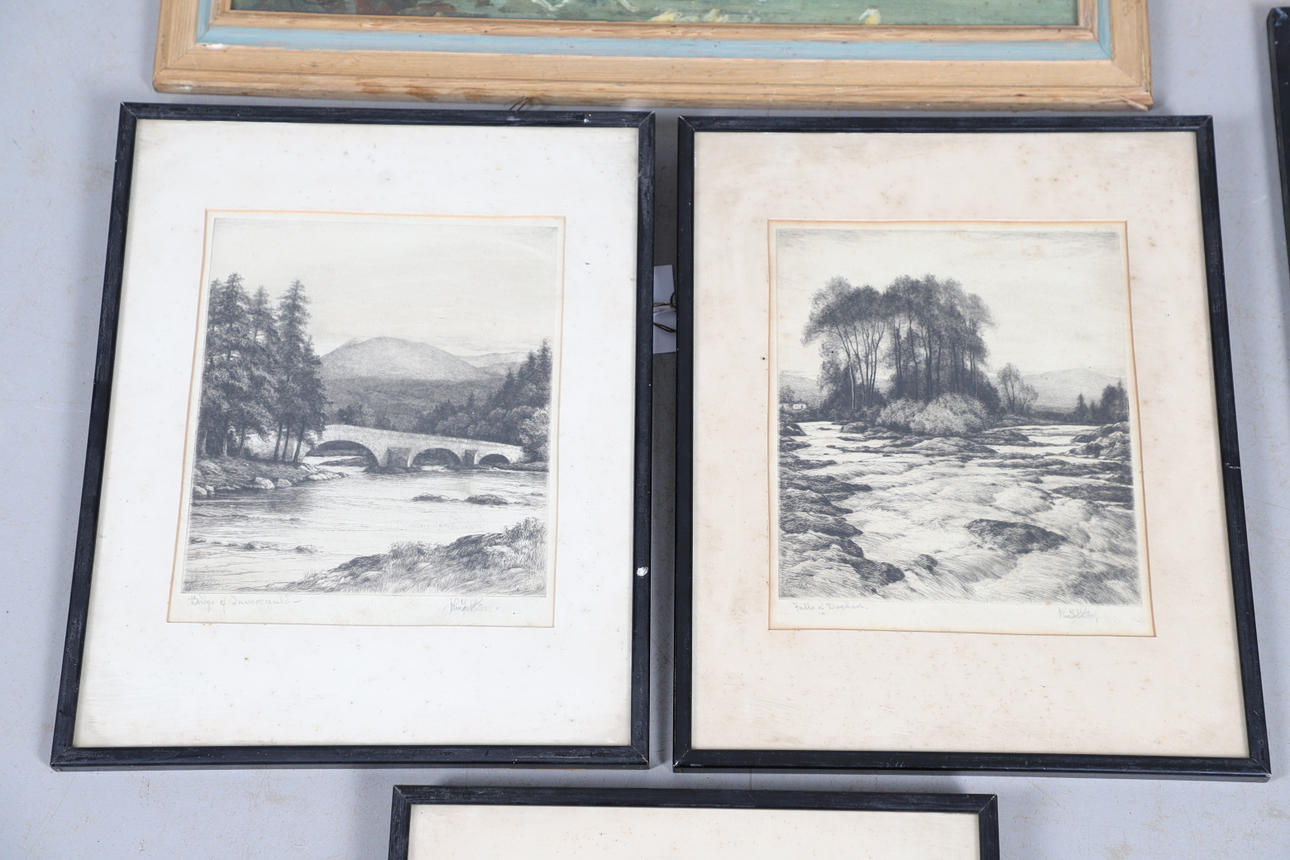 Comprising three etchings by John Fullwood (1854-1931) to include Lochay Killin; Falls of Dochart; and Bridge of Invercauld; together with an etching of a country house by William Monk; a frame of eight Regency `riddle` cards, hand coloured but stuck down; and a modern colour print after Munnings (6).