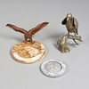 A large brass model of an Eagle with wings outstretched, mounted on a heavy onyx circular dish (dish 30cms across). Also with a large brass figure of a Bird (39cms high), and a carved dish (20cms diameter). (3).
