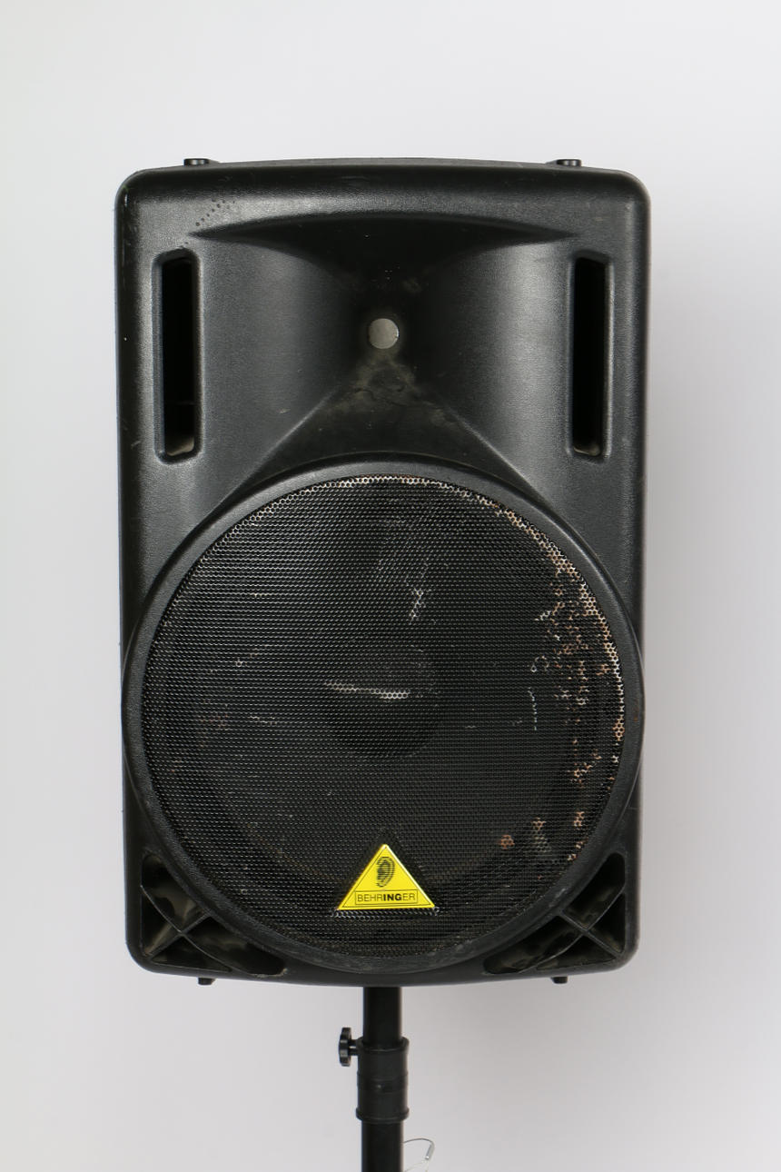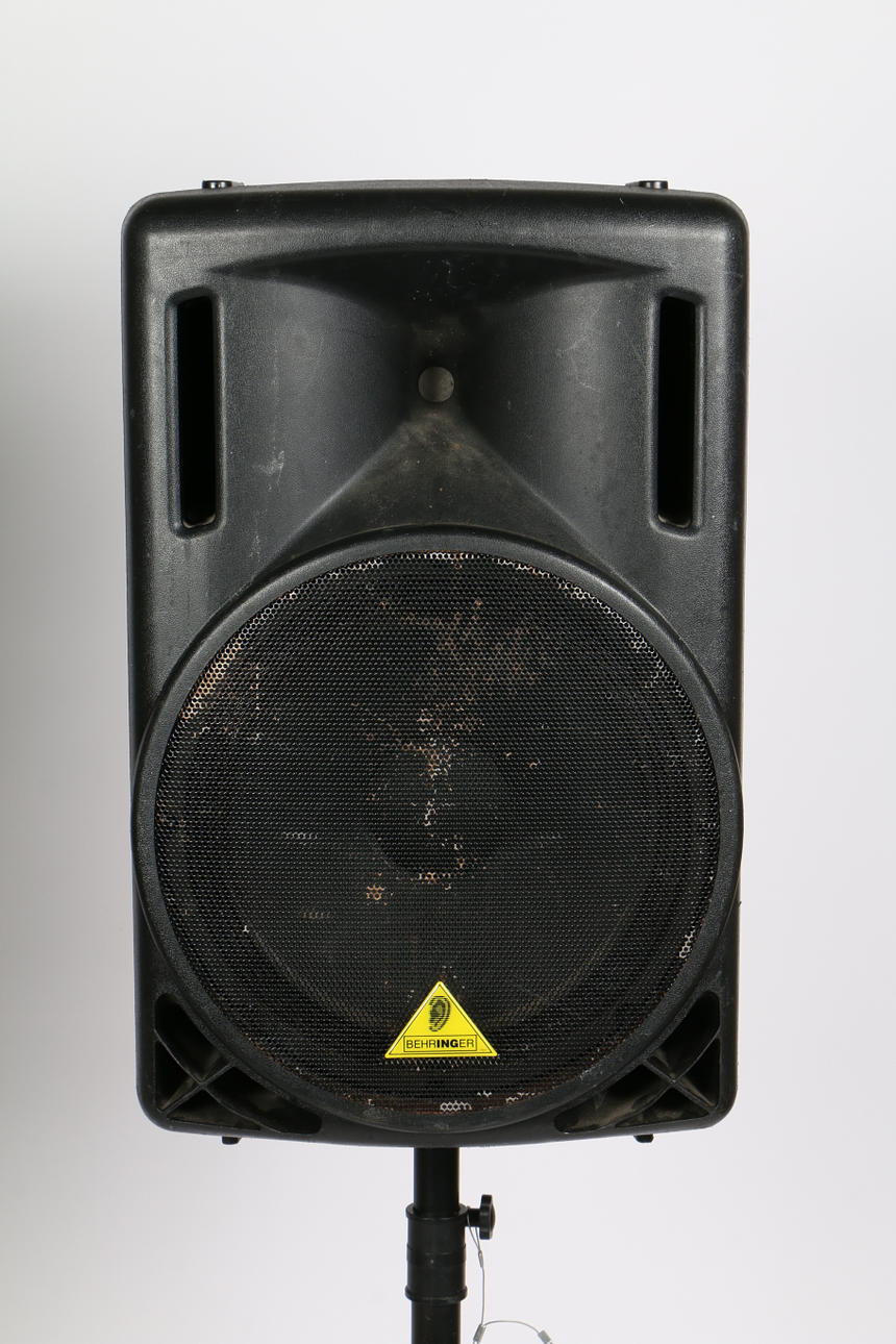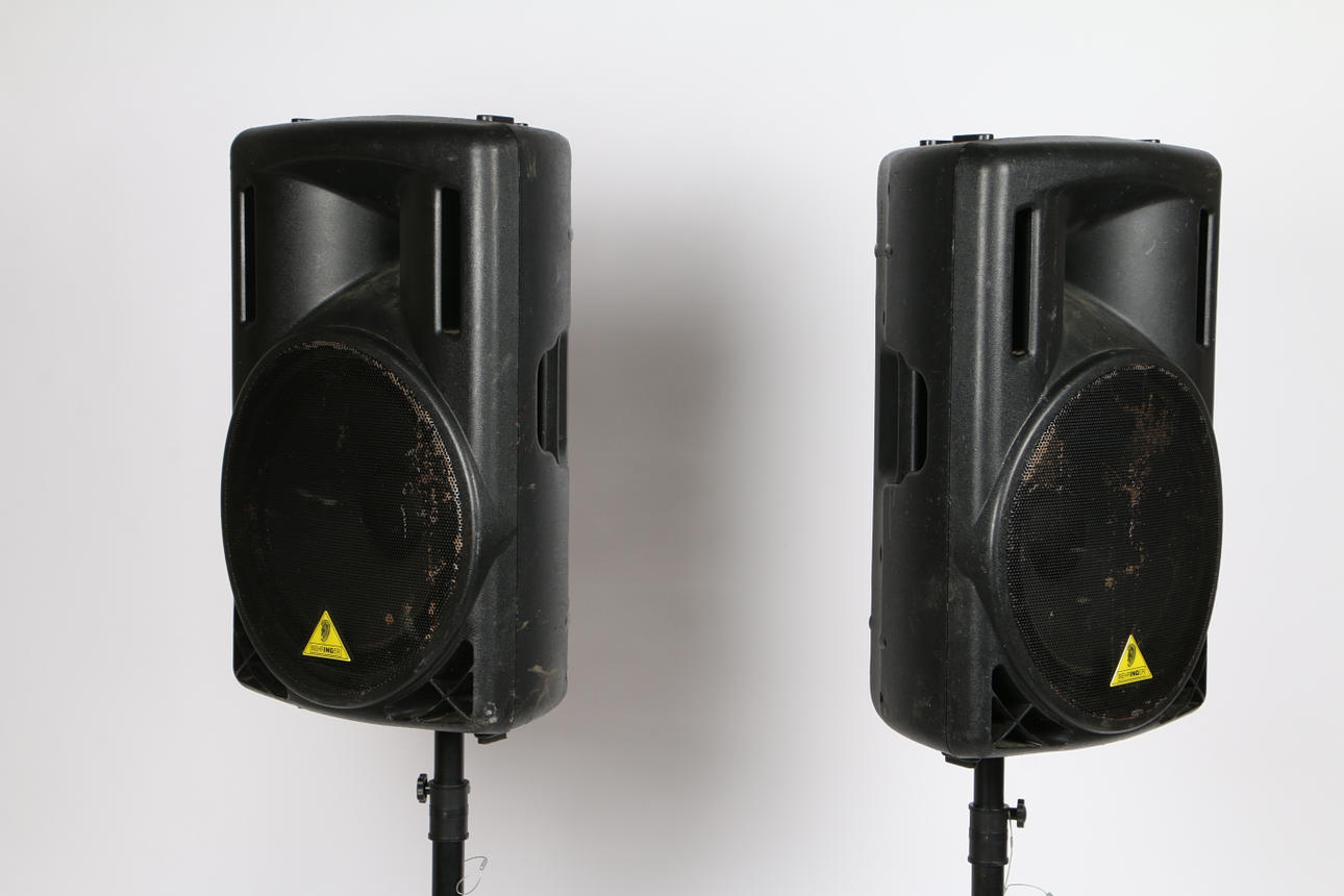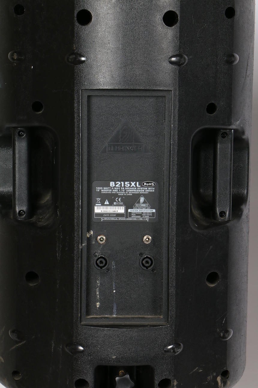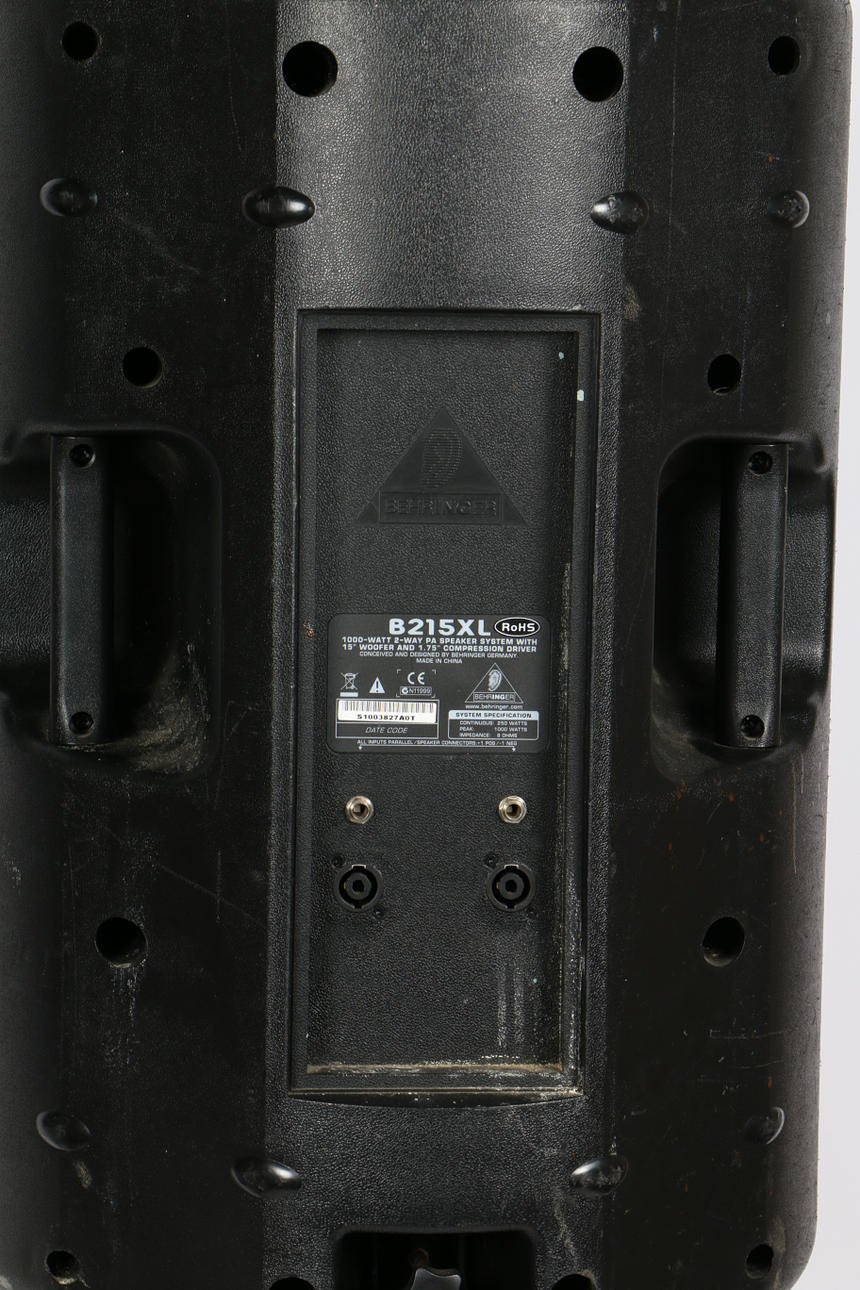 A pair of B215XL passive loudspeakers by Behringer, serial no. S1003827AOT & A1003111AOT, together with a pair of unmarked speaker stands, speakers measuring 69cm height without stands. (4).