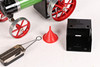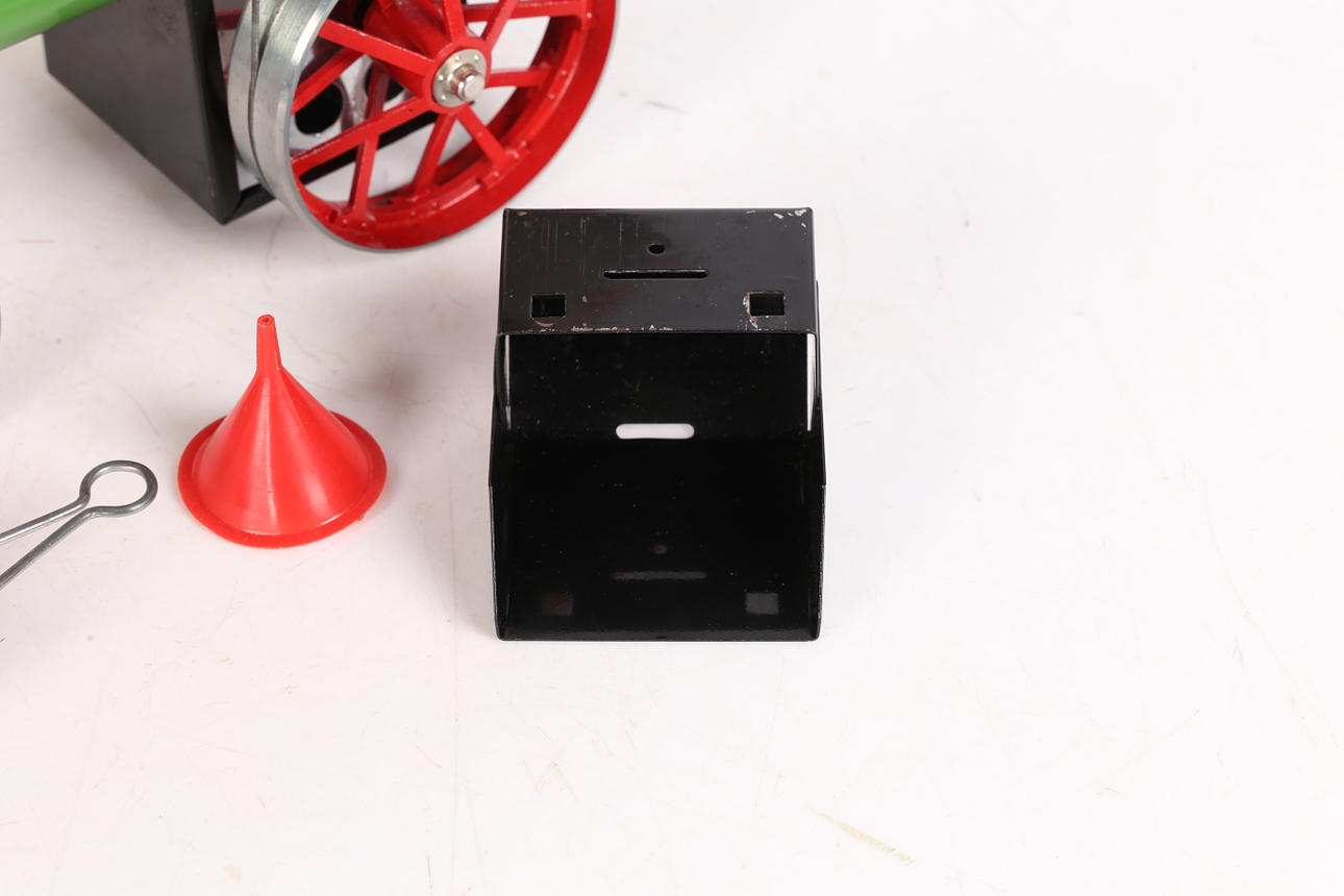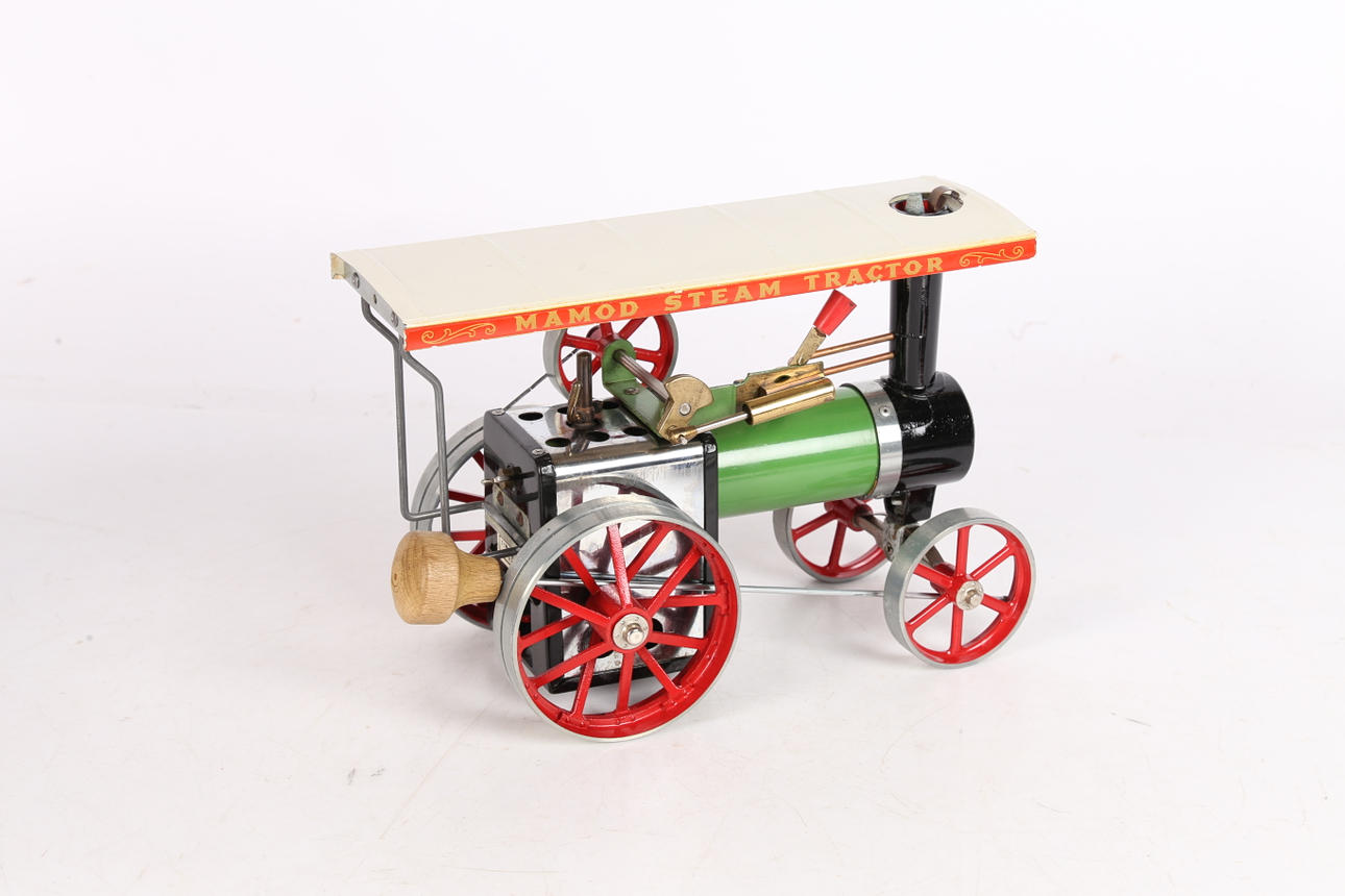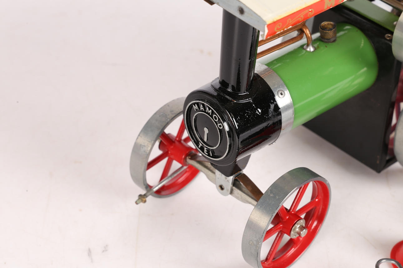 An original vintage Mamod live steam model Steam Tractor T.E.1A Traction Engine. A green and red model of a solid fuel example. Boxed with lamp and detachable steering rod.