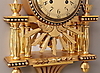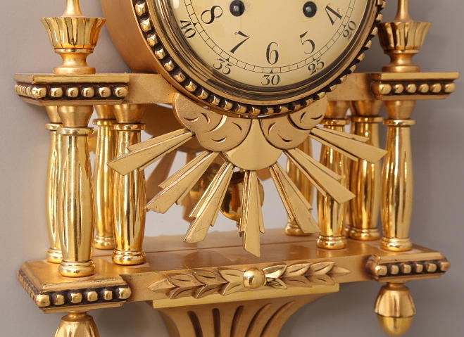 WALL CLOCK, gold pendulum, columns, mid 20th century.