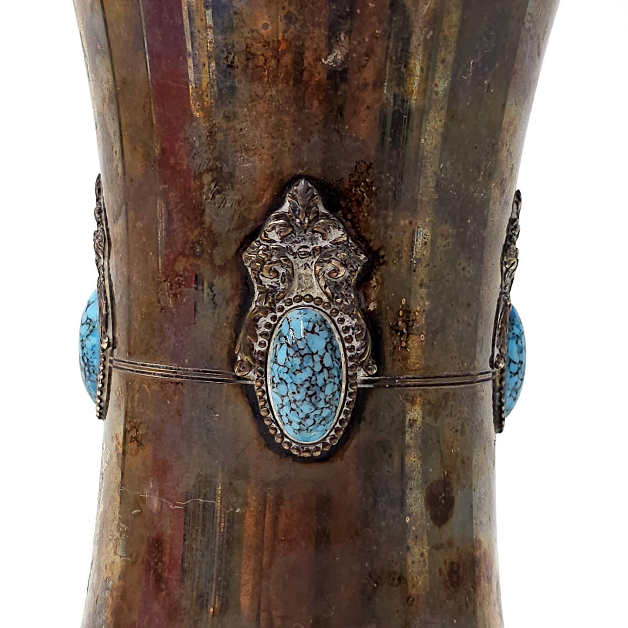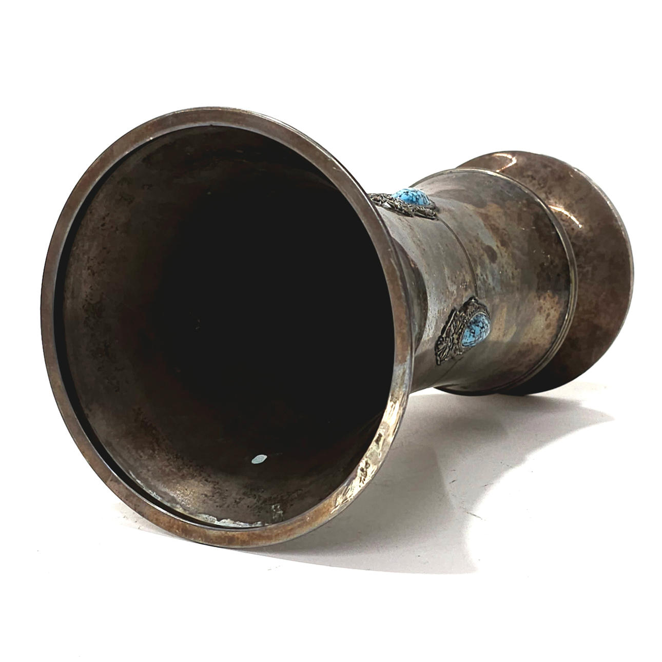 SILVER ALPACA VASE WITH TURQUOISE CABOCHON APPLICATIONS.