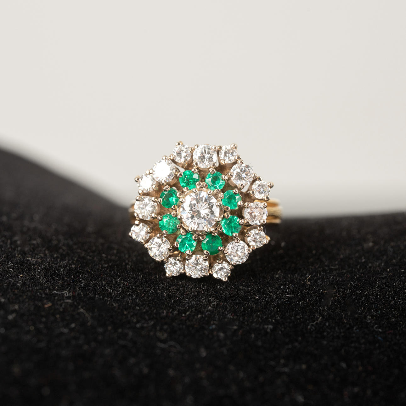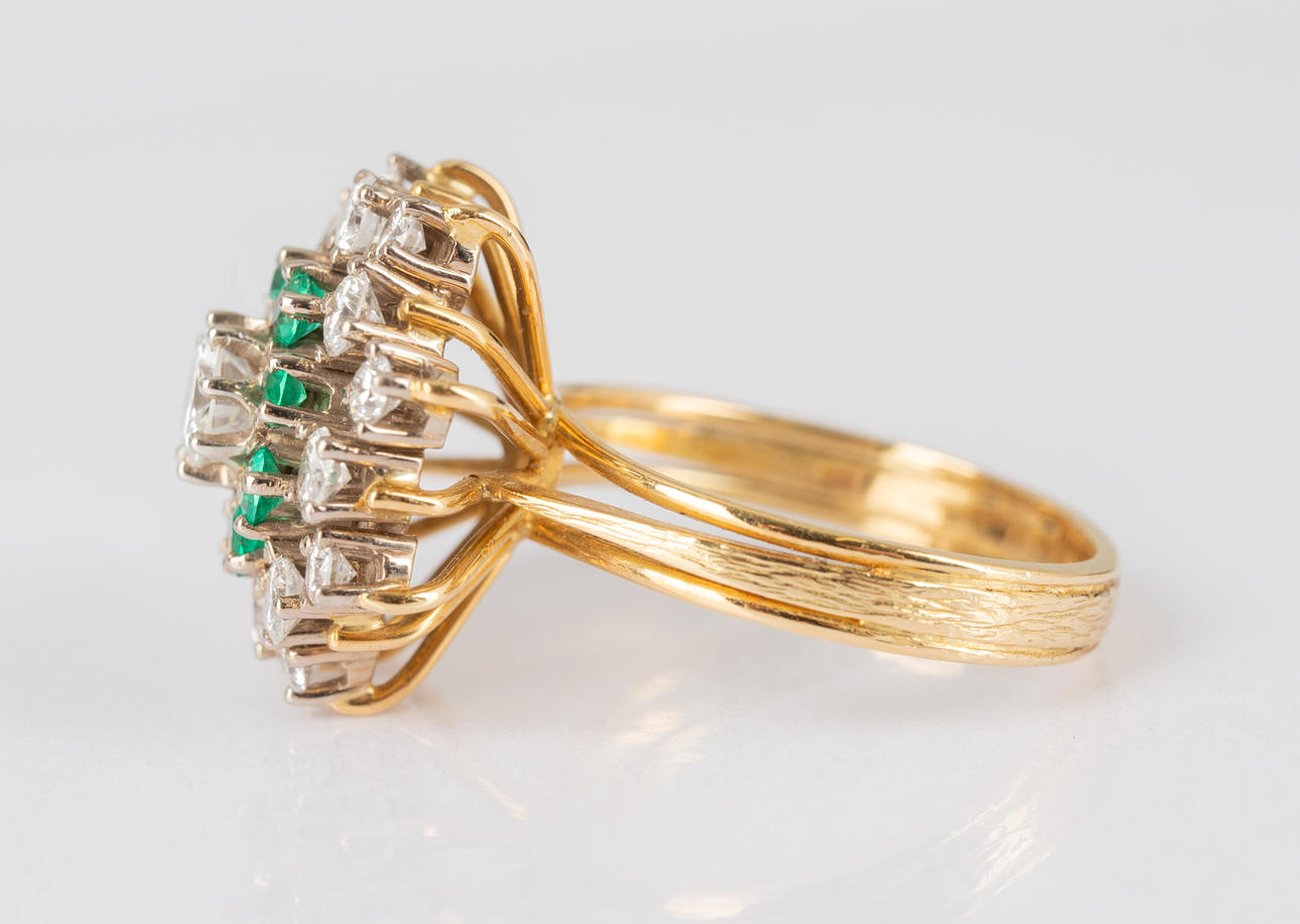 Ring made of 750 gold, set with emeralds and diamonds totalling approx. 1.40 ct, Colour: Top Wesselton - Wesselton (G-H), Clarity: VS-SI. Ring size approx. 54. Weight ca. 8.6 grams.