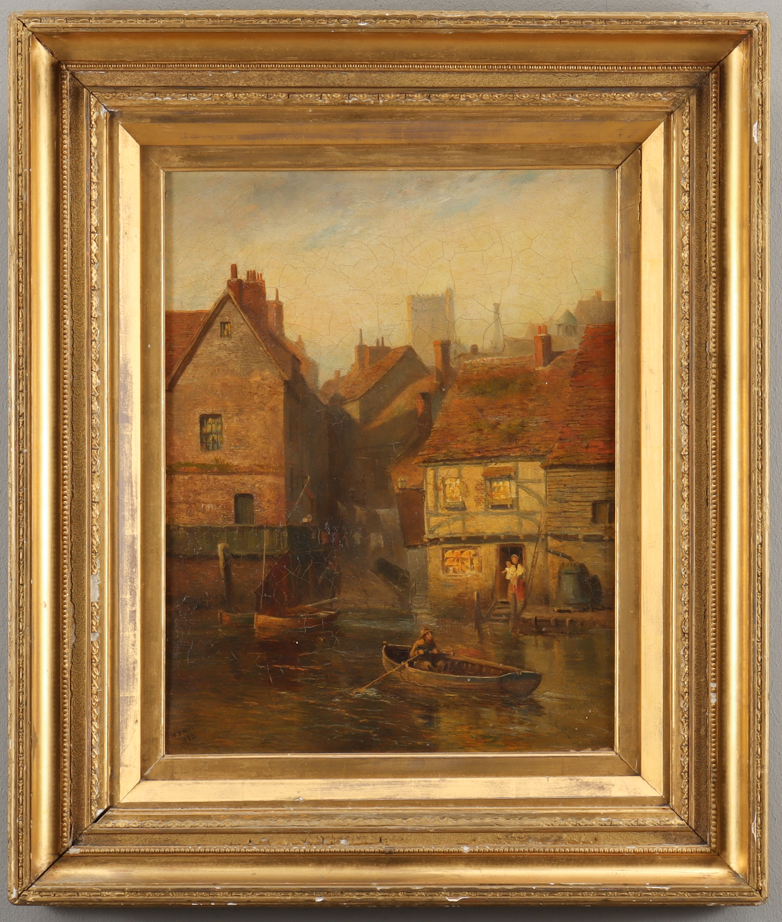 3581328. ATTRIBUTED TO WILLIAM EGERTON HINE. City scene by canal.