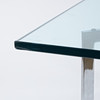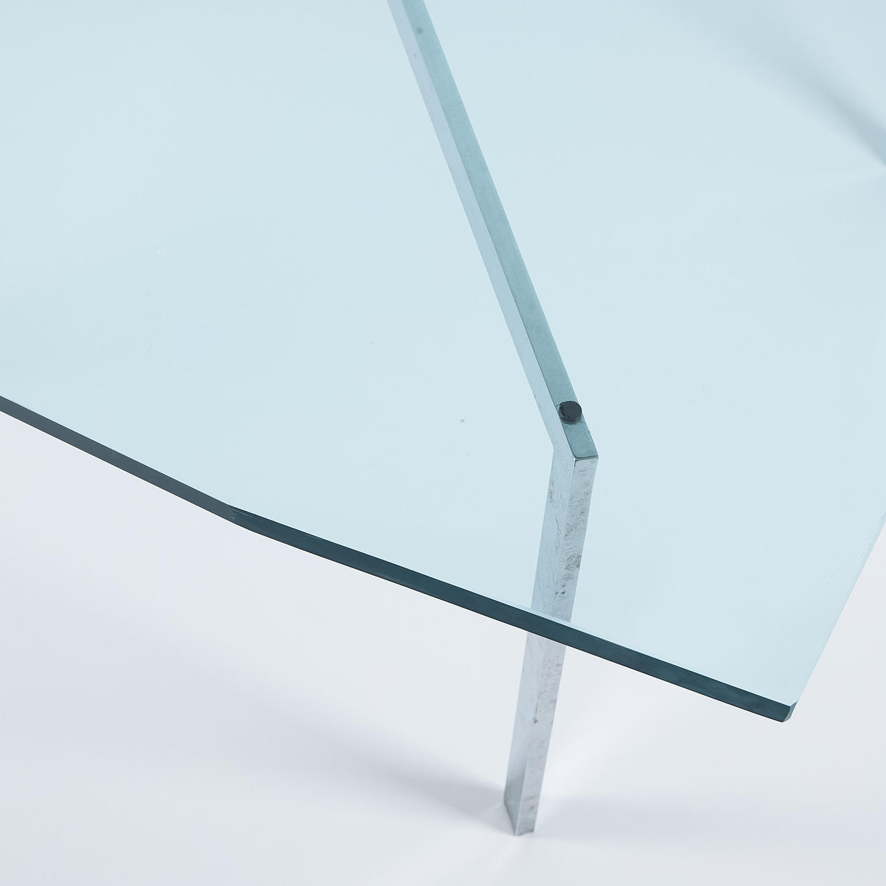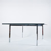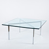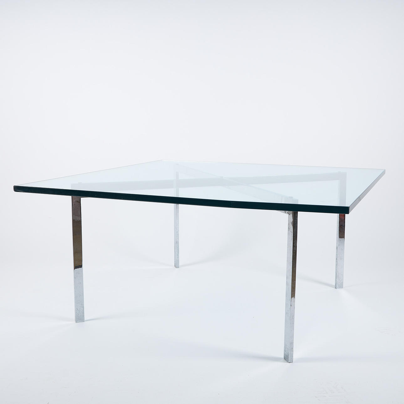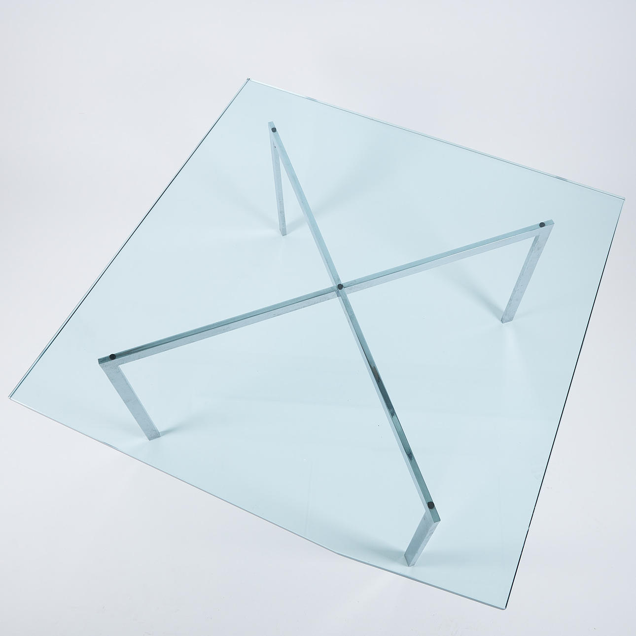 Chrome-plated steel chassis, glass top, height 46,5 cm, plate approx. 100x100 cm.