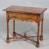 Featuring a single drawer with copper colour ring pulls, turned legs united by an x frame stretcher with a decorative turned finial to the centre. Height 76cm x Width 84cm x Depth 53cm.