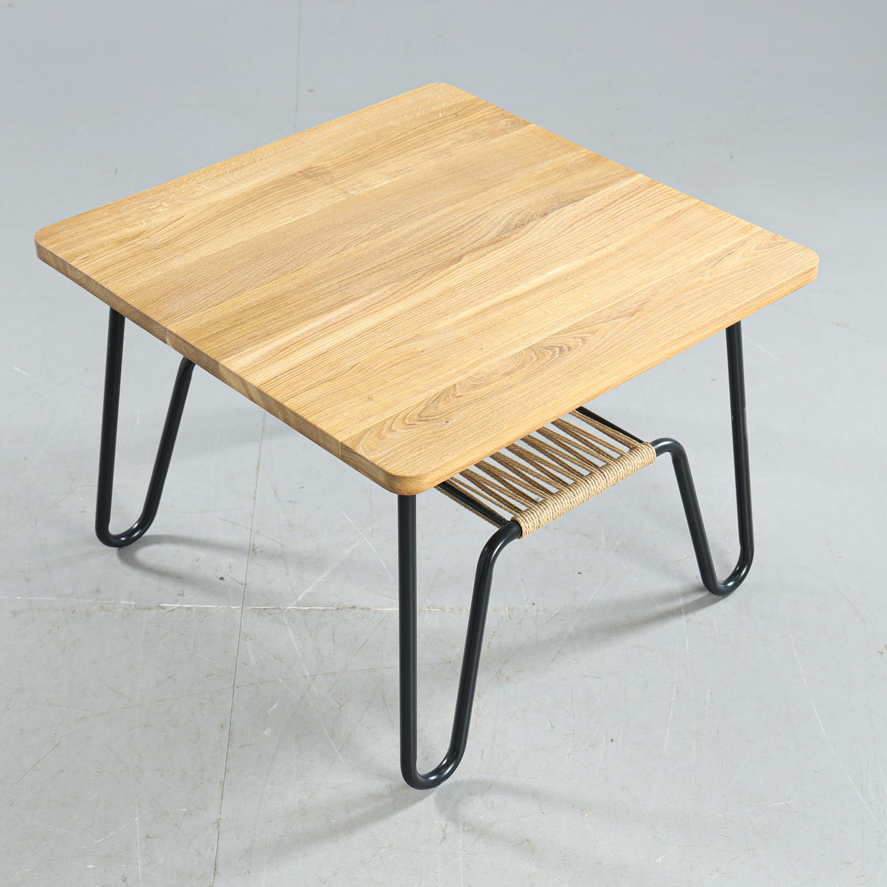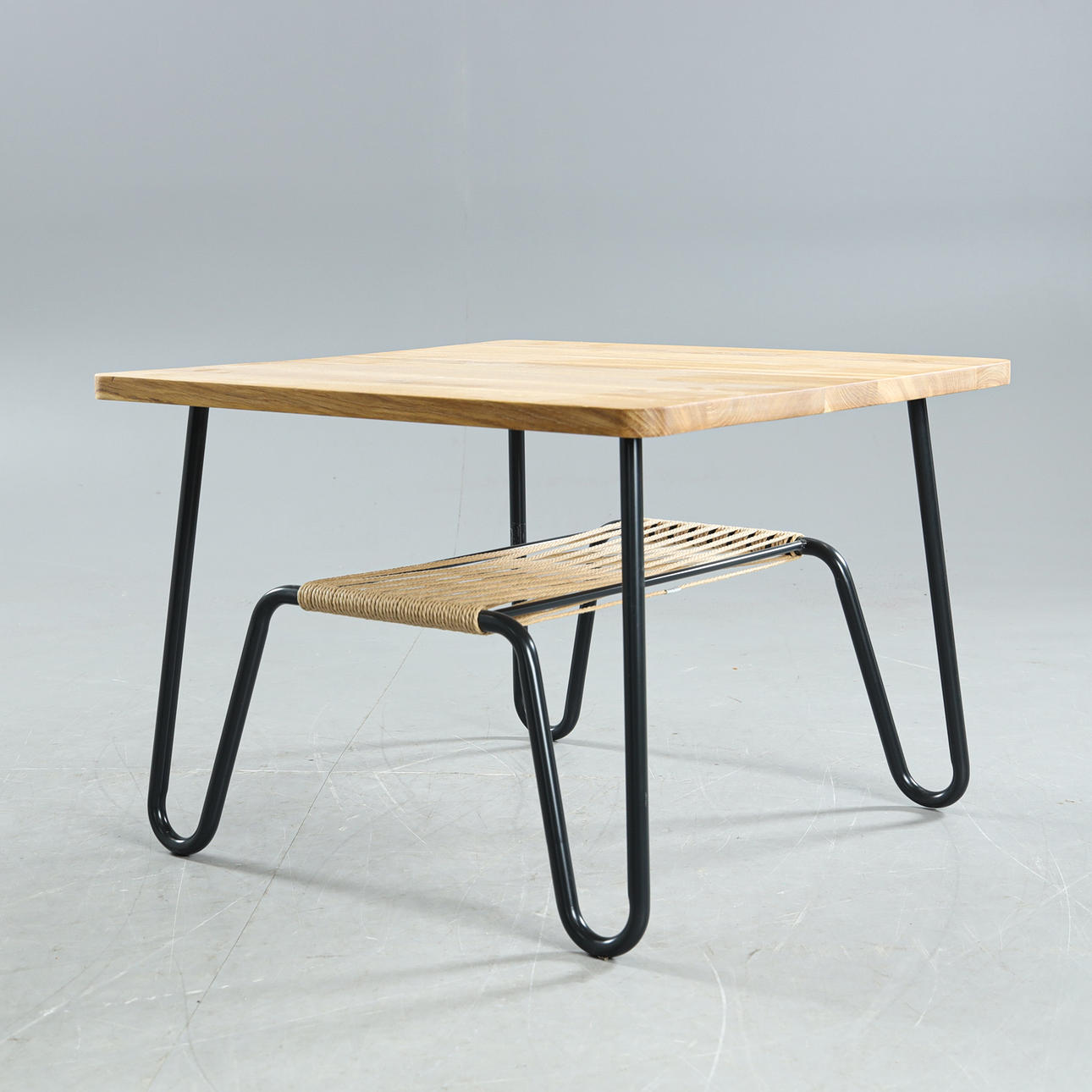 Solid oiled oak board, shelf in hand-braided cardboard cord, metal frame, height approx. 50, 70x70 cm.