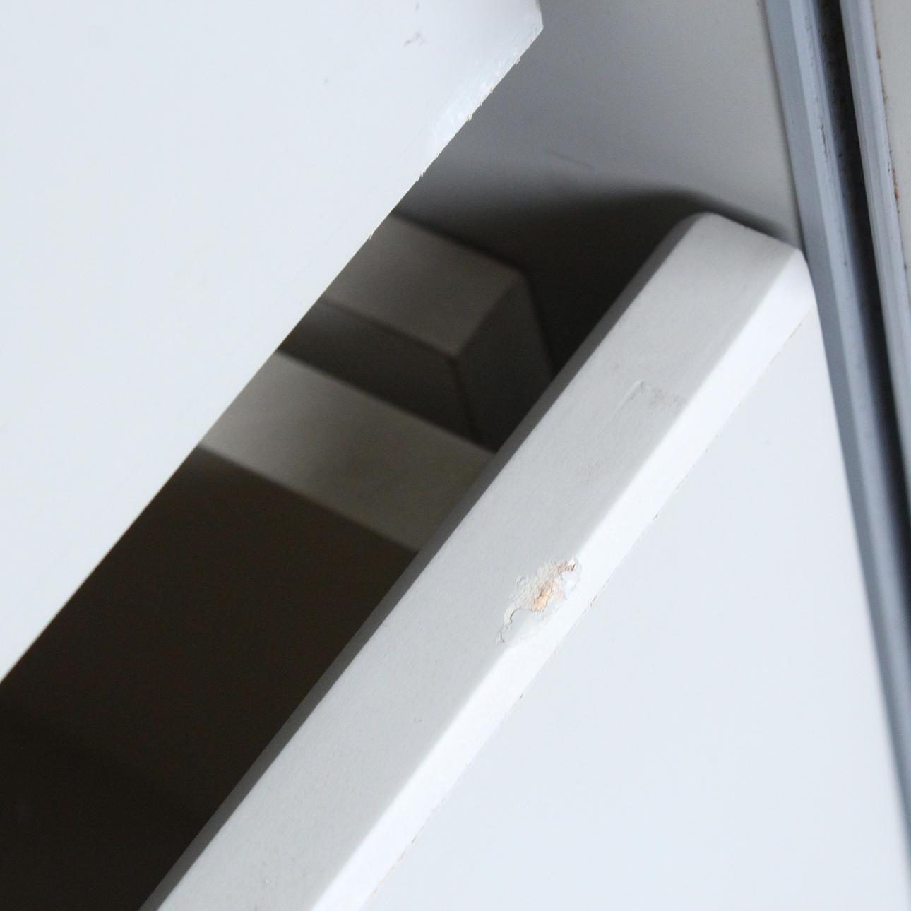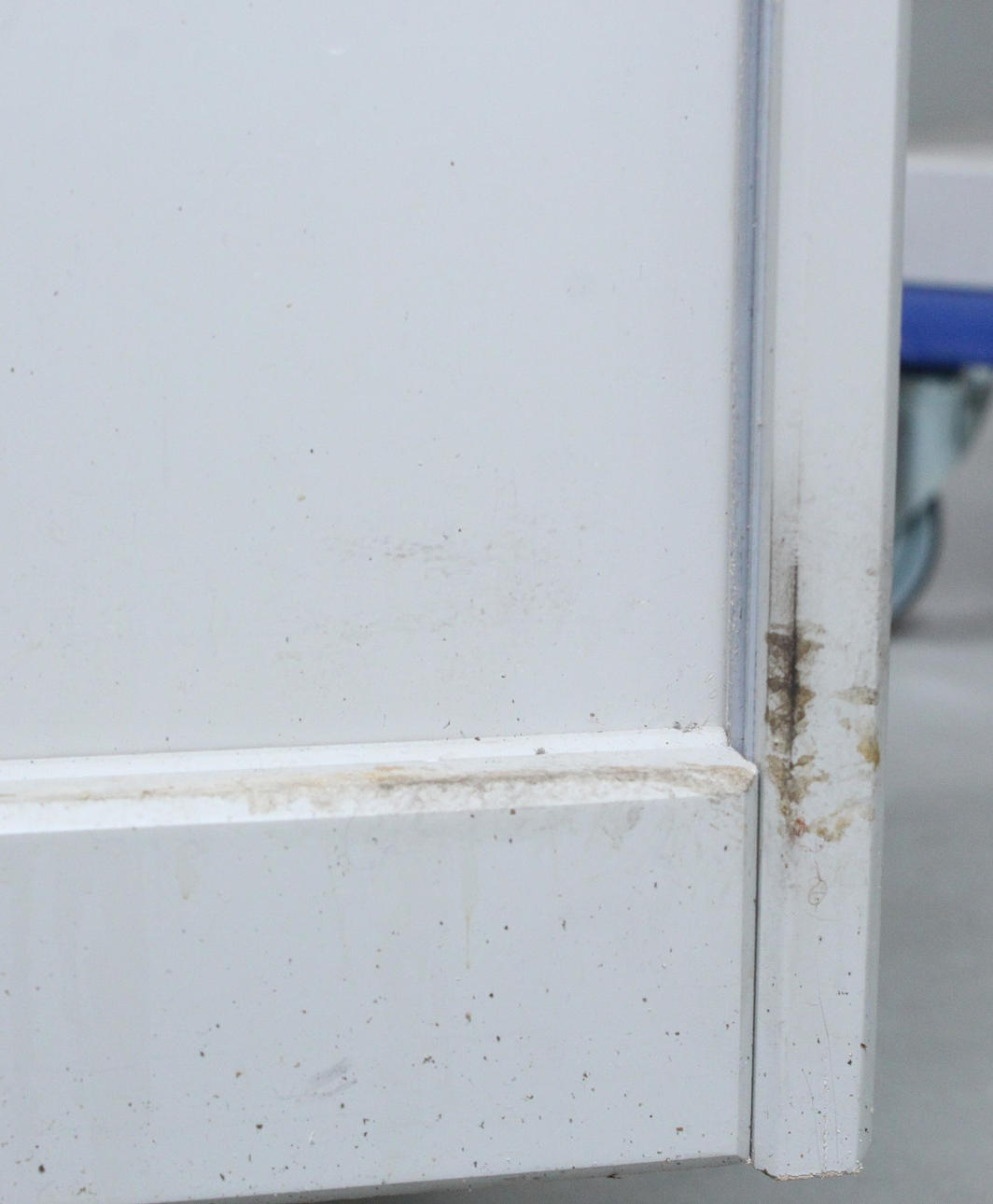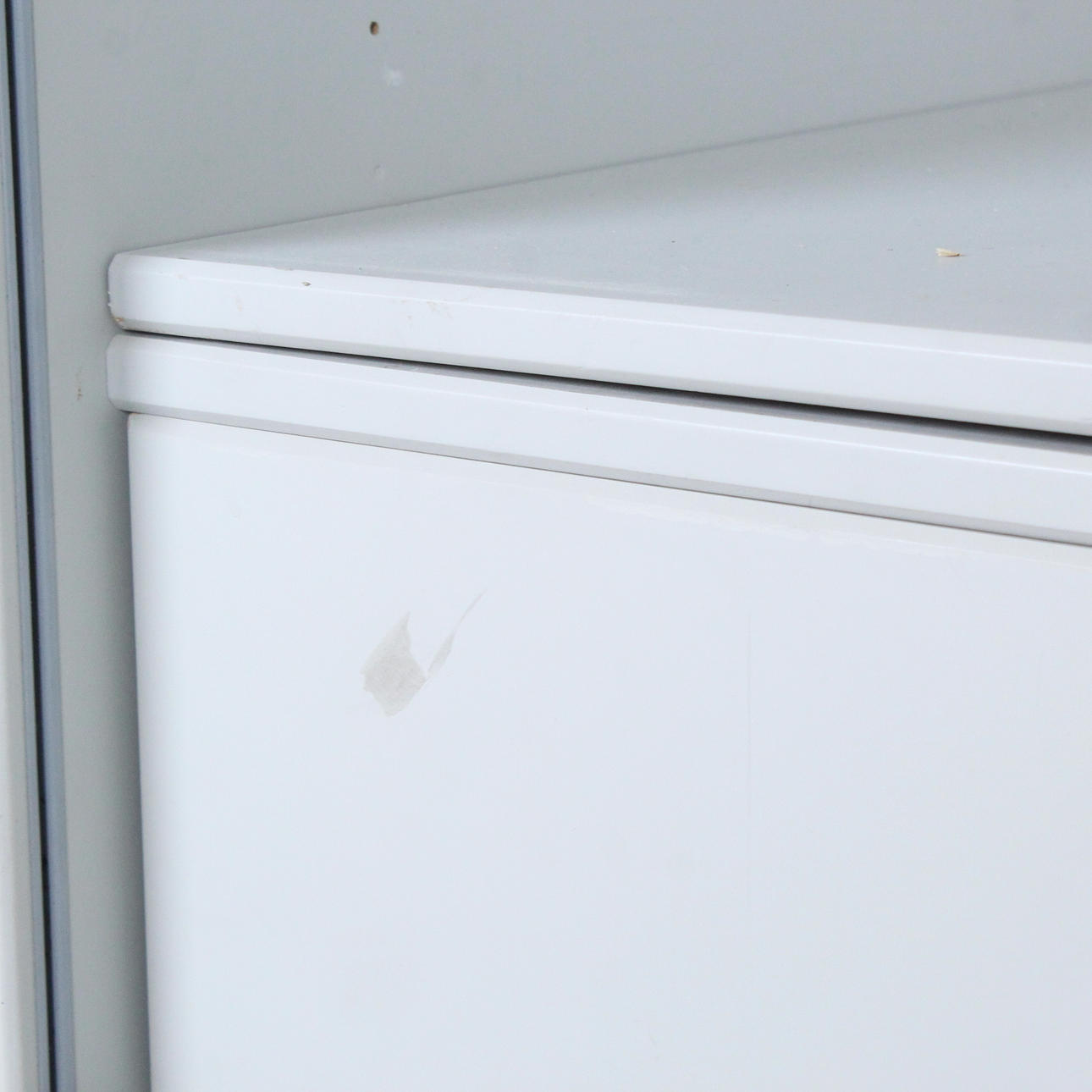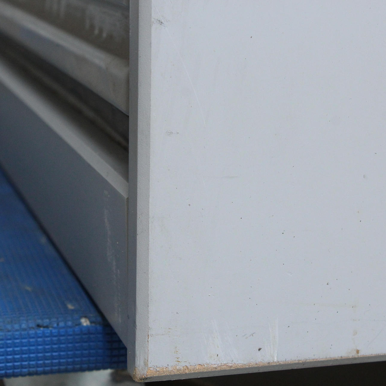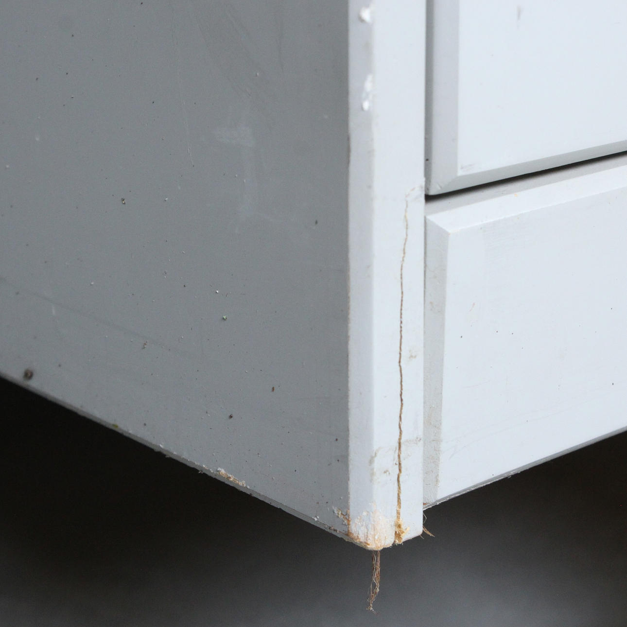 Age-appropriate signs of use and rubbing, scratches, rubbing and bumping in wood and plastic, partial paint stains, sometimes cracks in the wood, the three shades of gray of the cabinets differ somewhat.
