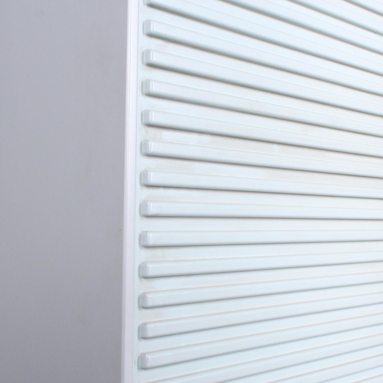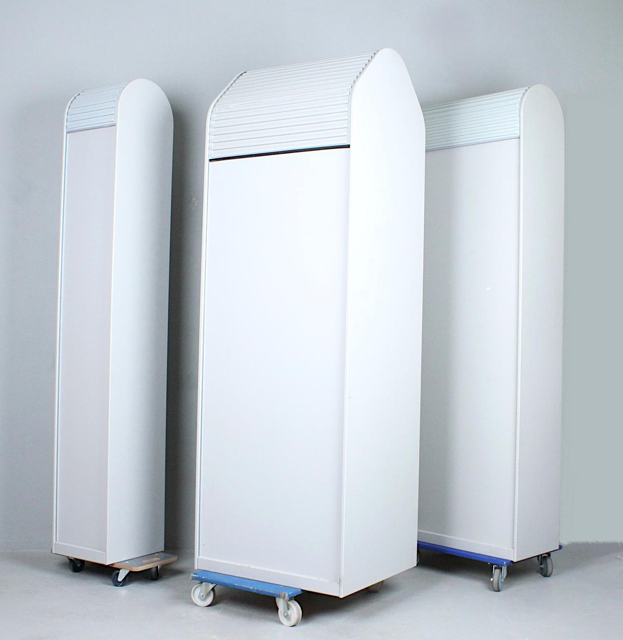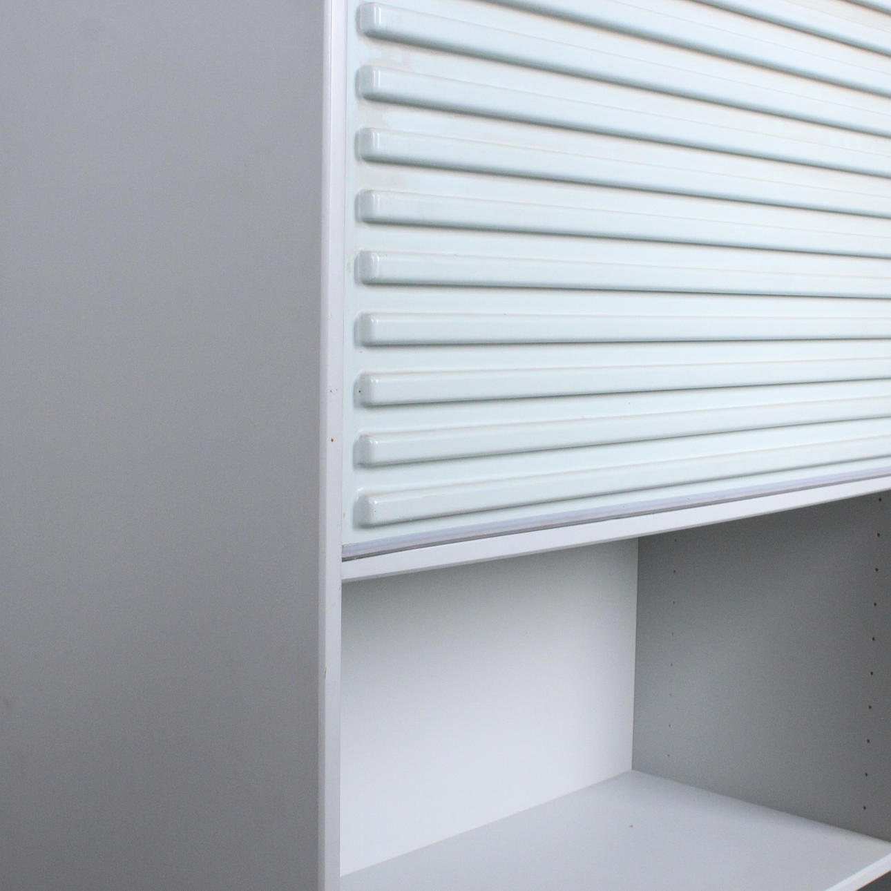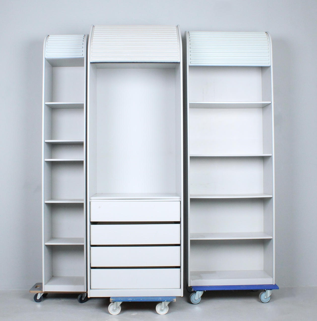 Aldo van den Nieuwelaar (1944-2010) for Pastoe, three shutter cabinets/office cabinets with roller door, model 'A'Dammer', design from 1978, light grey lacquered wood construction, profiled plastic sliding doors, interior with shelves and four drawers,