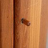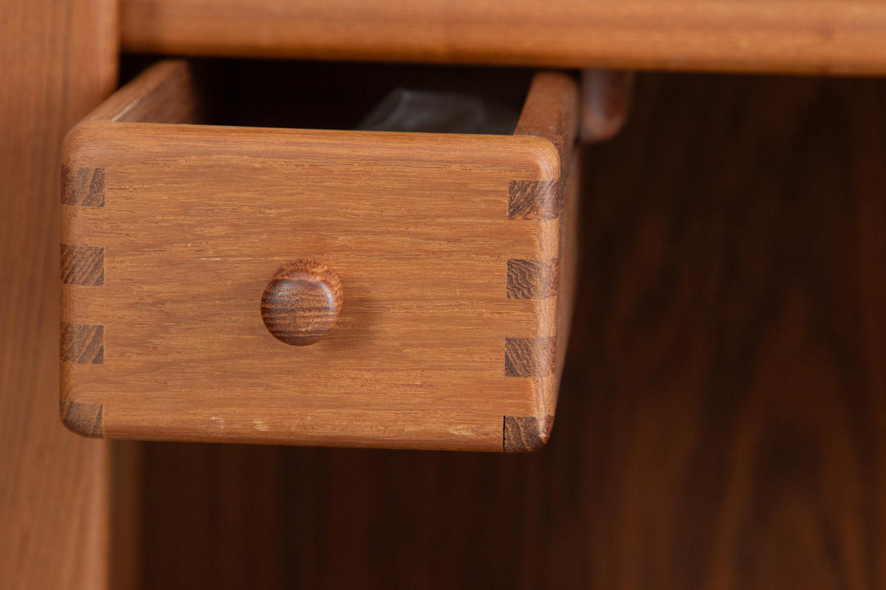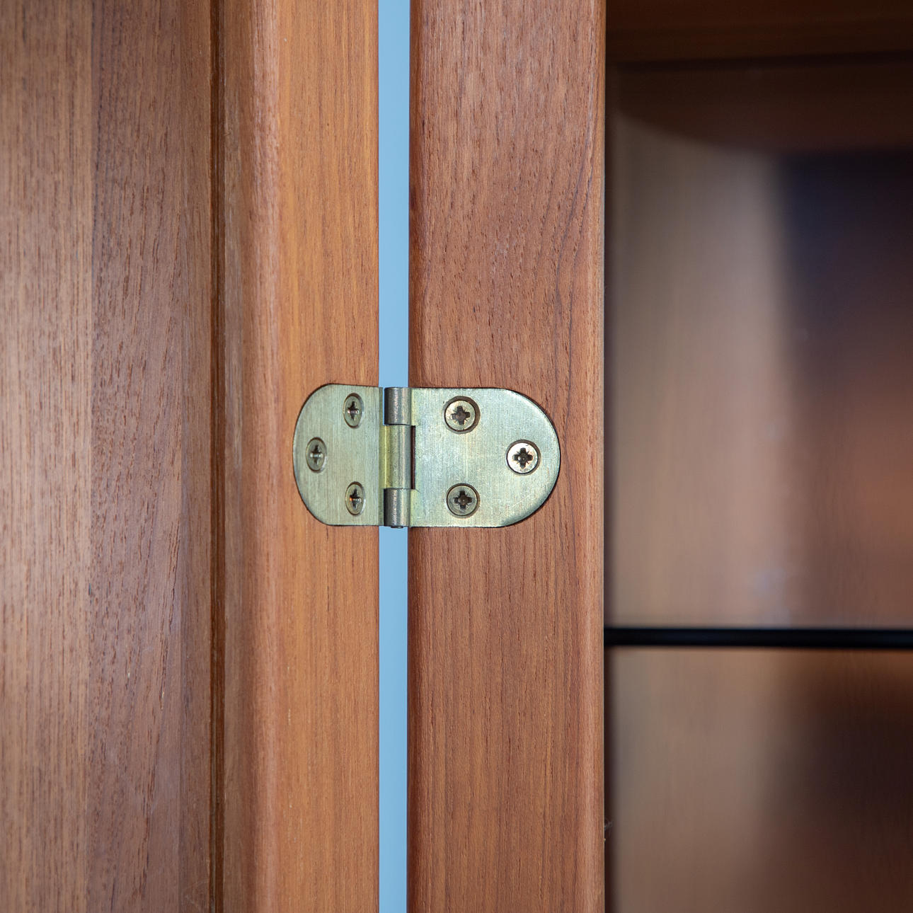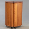 teak wood Cabinet on wheels. Interior with compartments, glass shelves, reflective film and adjustable crossbars. Lockable, key available