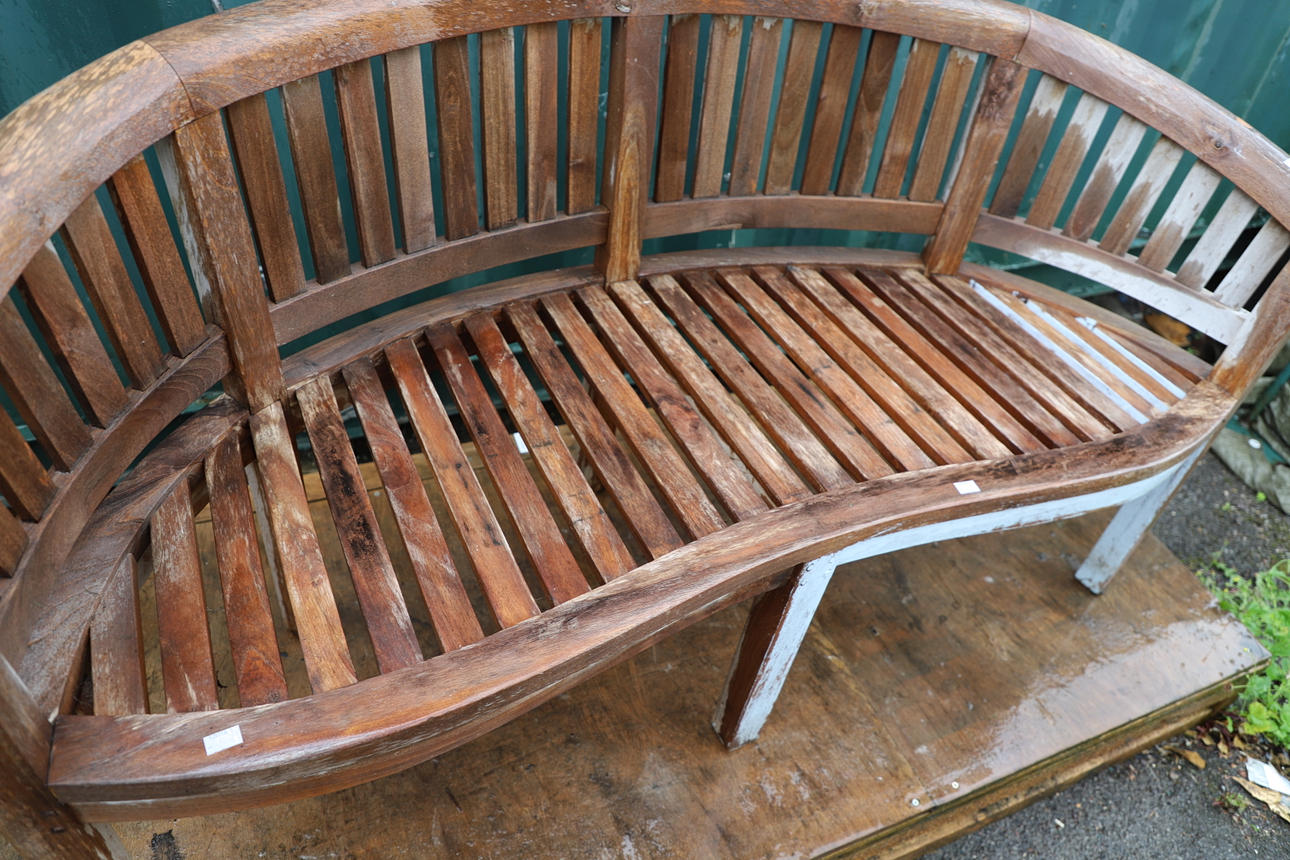 A CURVED TEAK GARDEN BENCH.