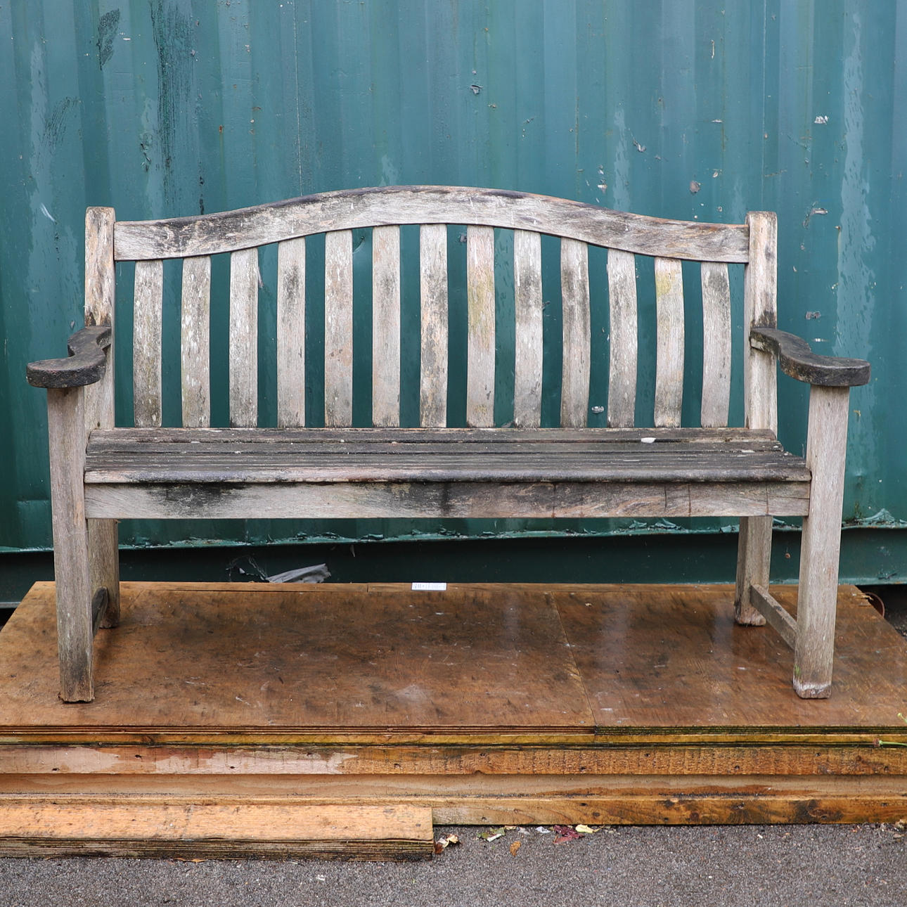 with arched back and wavy slatted back to scrolling arms, 94cm high x 156cm wide x 50cm deep.