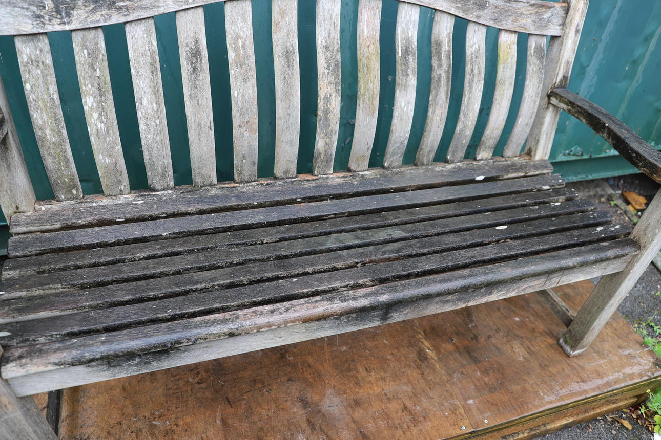 3596146. A WOODEN SLATTED GARDEN BENCH.