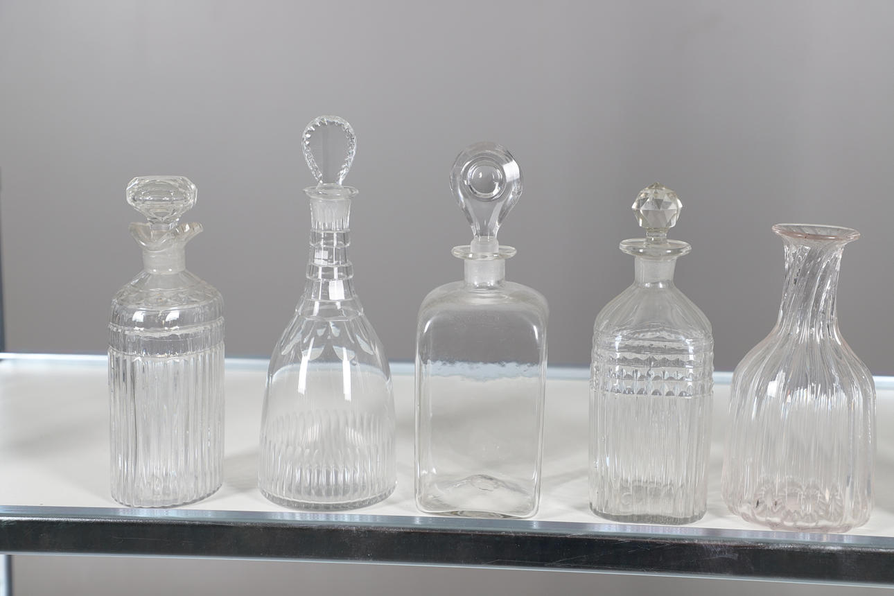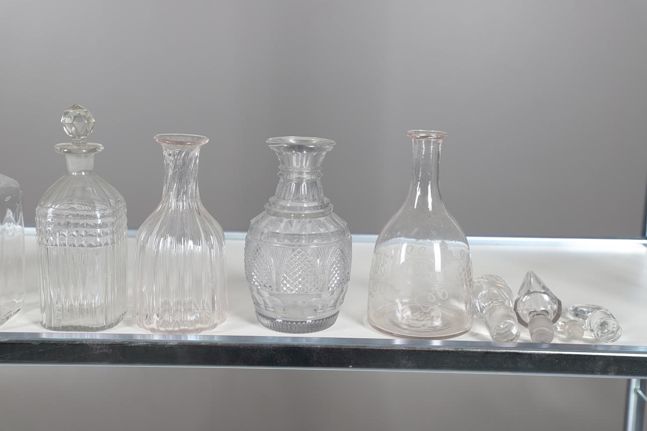 A mixed lot including a square shaped decanter with tear drop shaped stopper (22.5cms high), a square shaped hand blown decanter with curved corners, kick up base and tapering stem (bruises and small cracks, 24.5cms high), and a variety of other antique decanters and some loose stoppers.