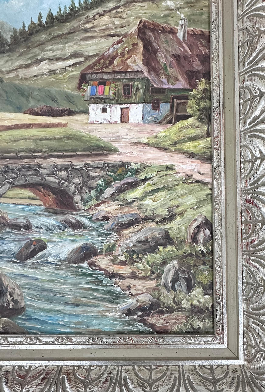 Lake landscape with house, signed, 49x42 cm.