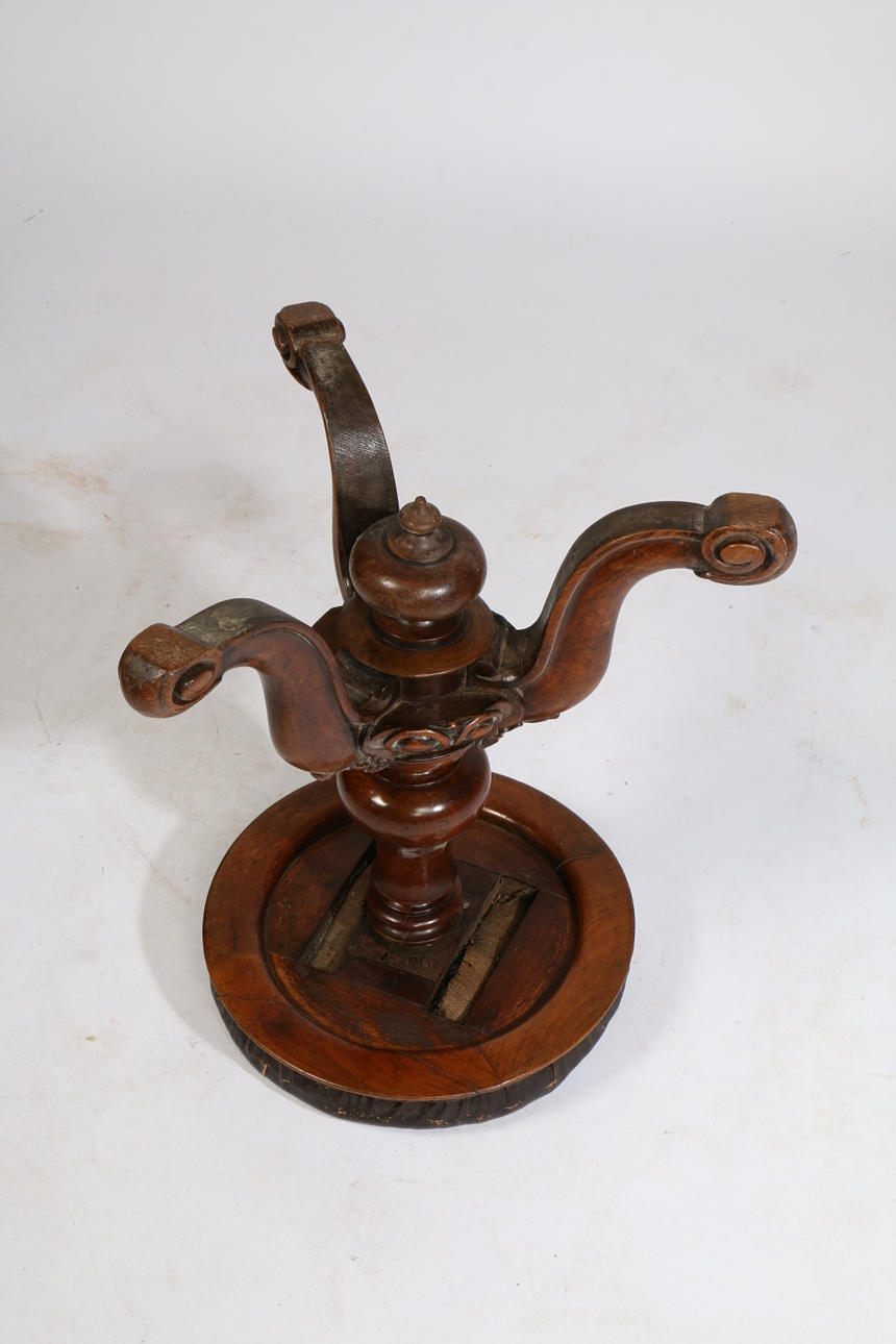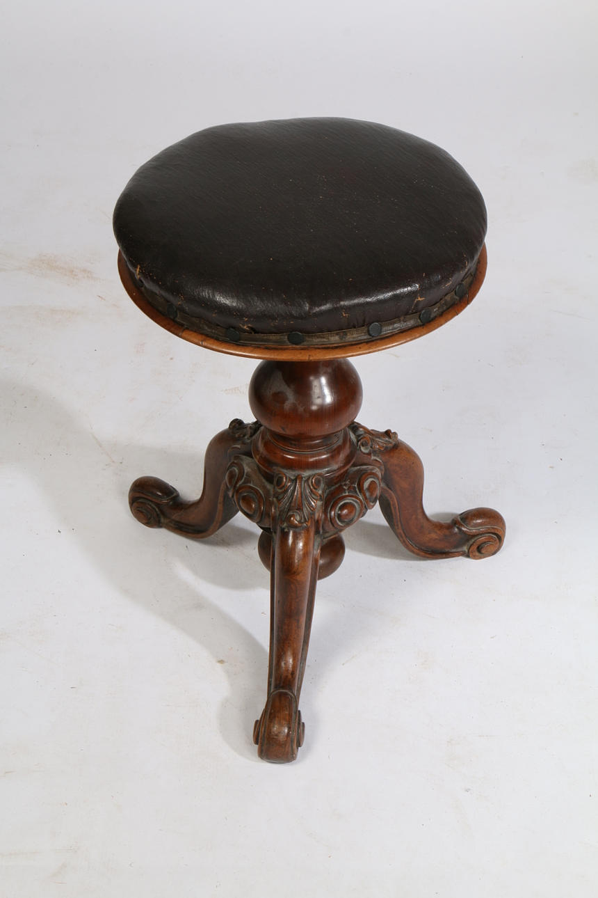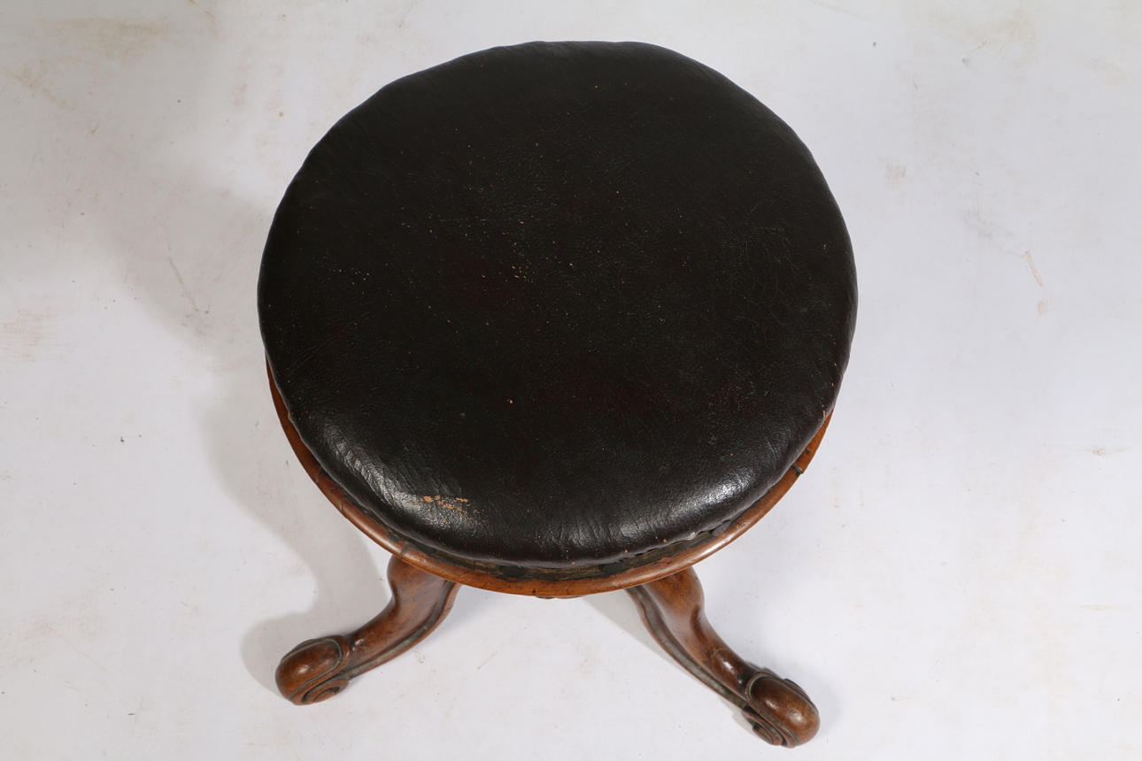 having a burgundy faux leather seat above a bulbous central column raised on tripod legs, 49cm high.