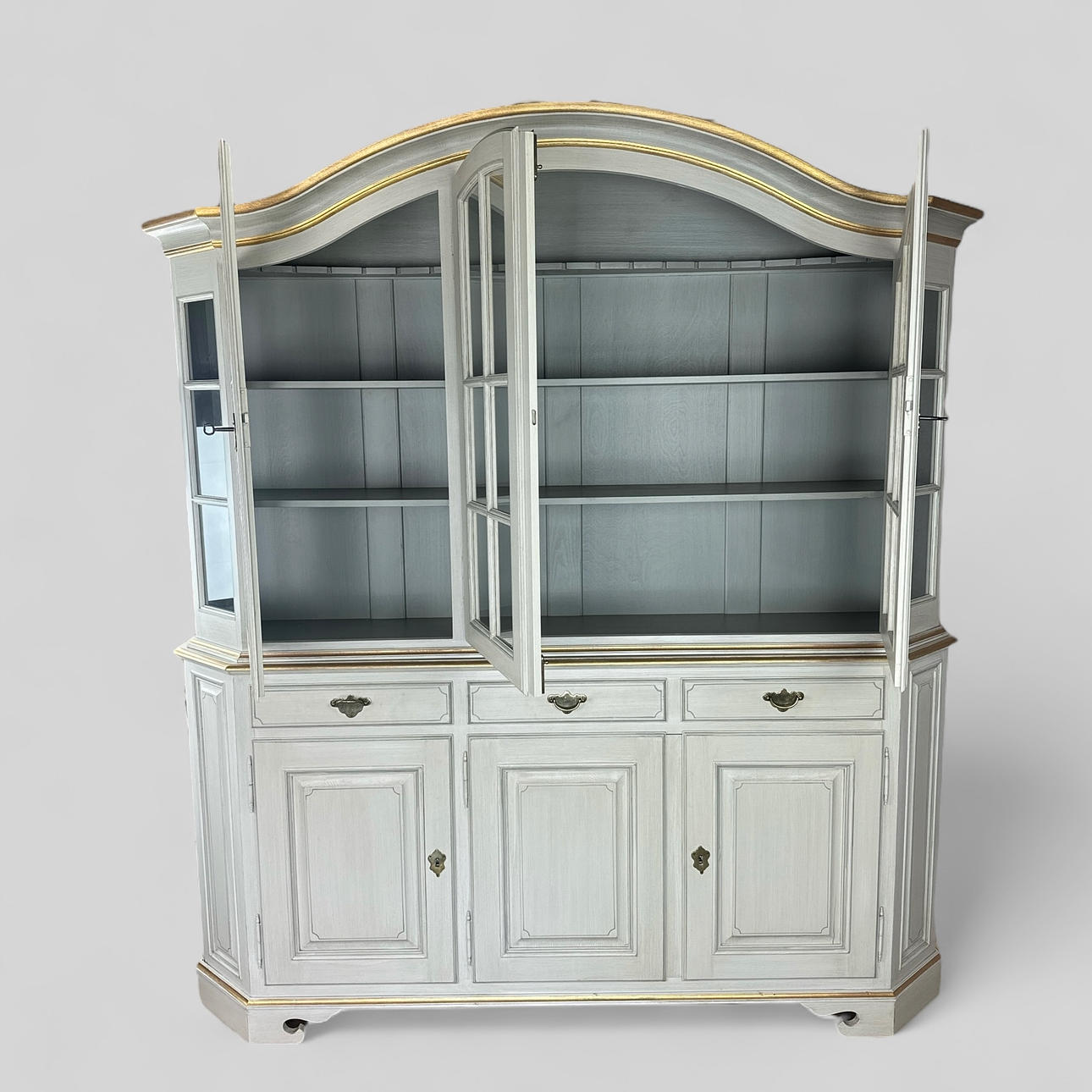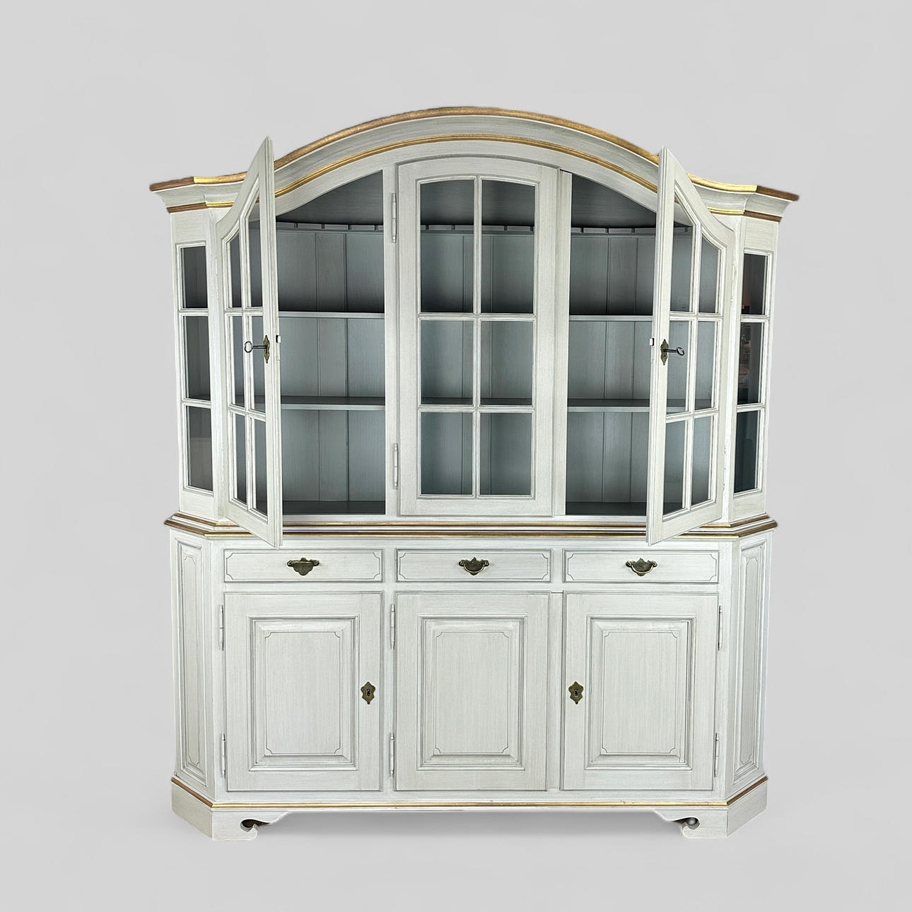 Top with three doors with display case with two rear fixed shelves.Bottom with two drawers, three doors with a rear fixed shelf.