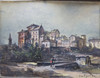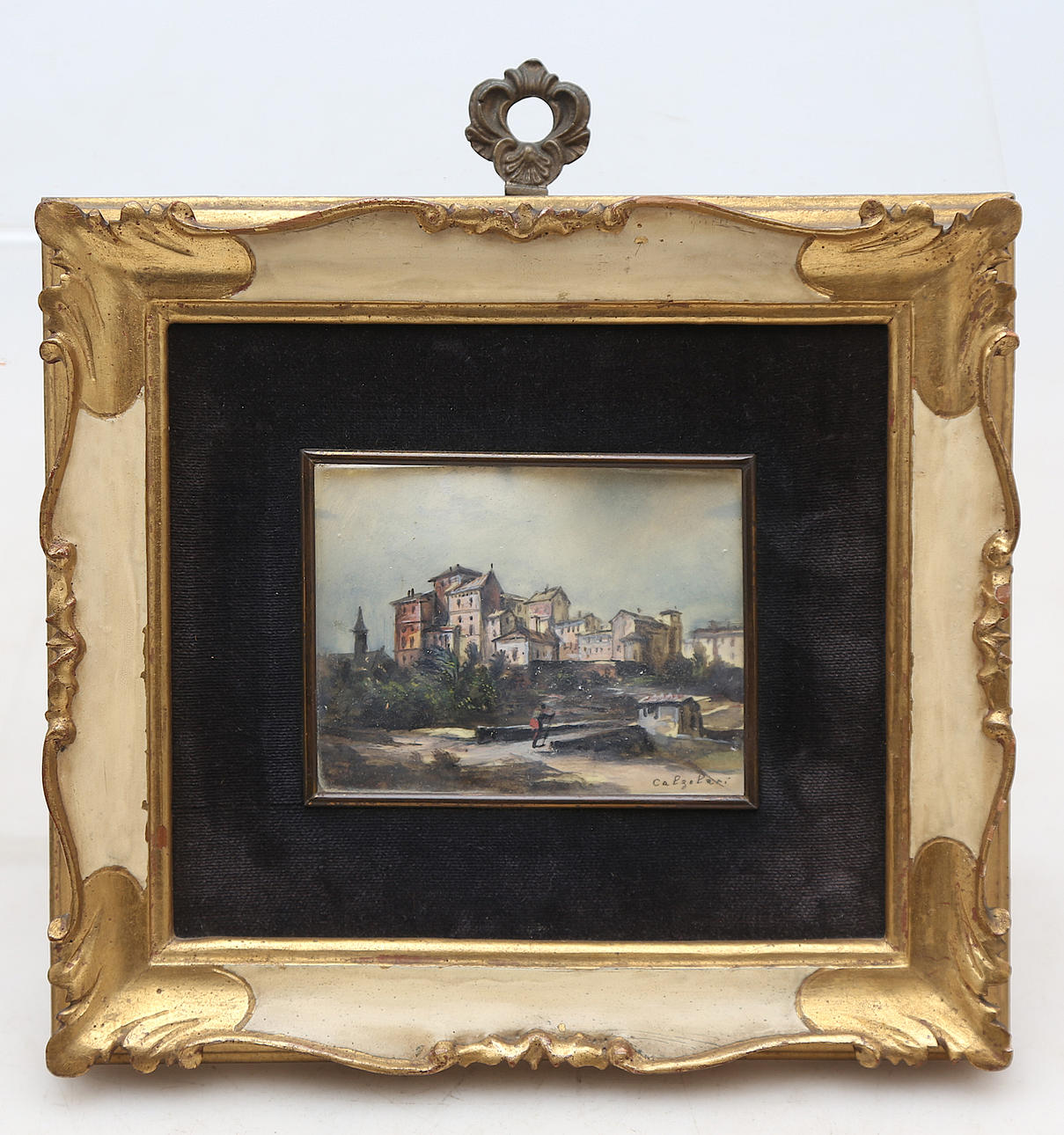 In good condition. Carved, painted and gilt wood frame.