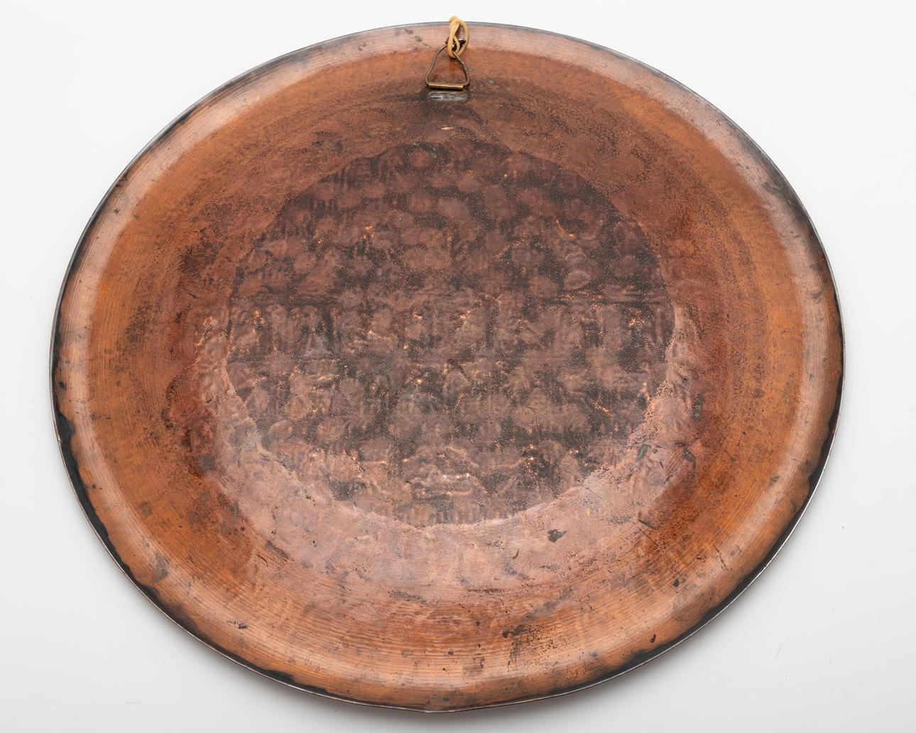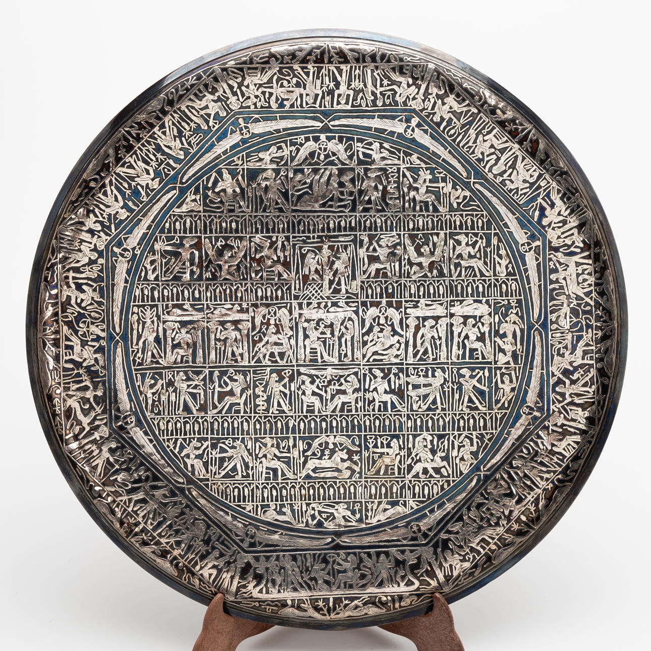 Nickel-plated copper. Completely inlaid depiction of pharaohs and gods of Egyptian mythology in silver. Ø approx. 40 cm.