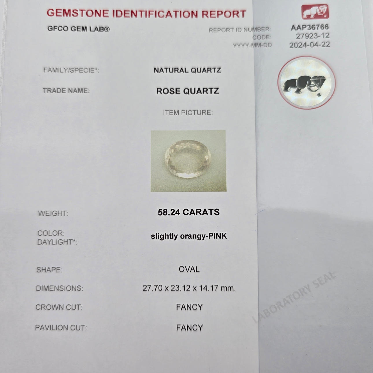 3611558. - 58.24ct Rose Quartz GFCO Swiss Certified.