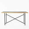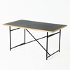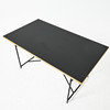 Chassis in blackened metal, table top in oak and linoleum, height and adjustable, board dimensions approx. 140,80, height between 70-85cm.