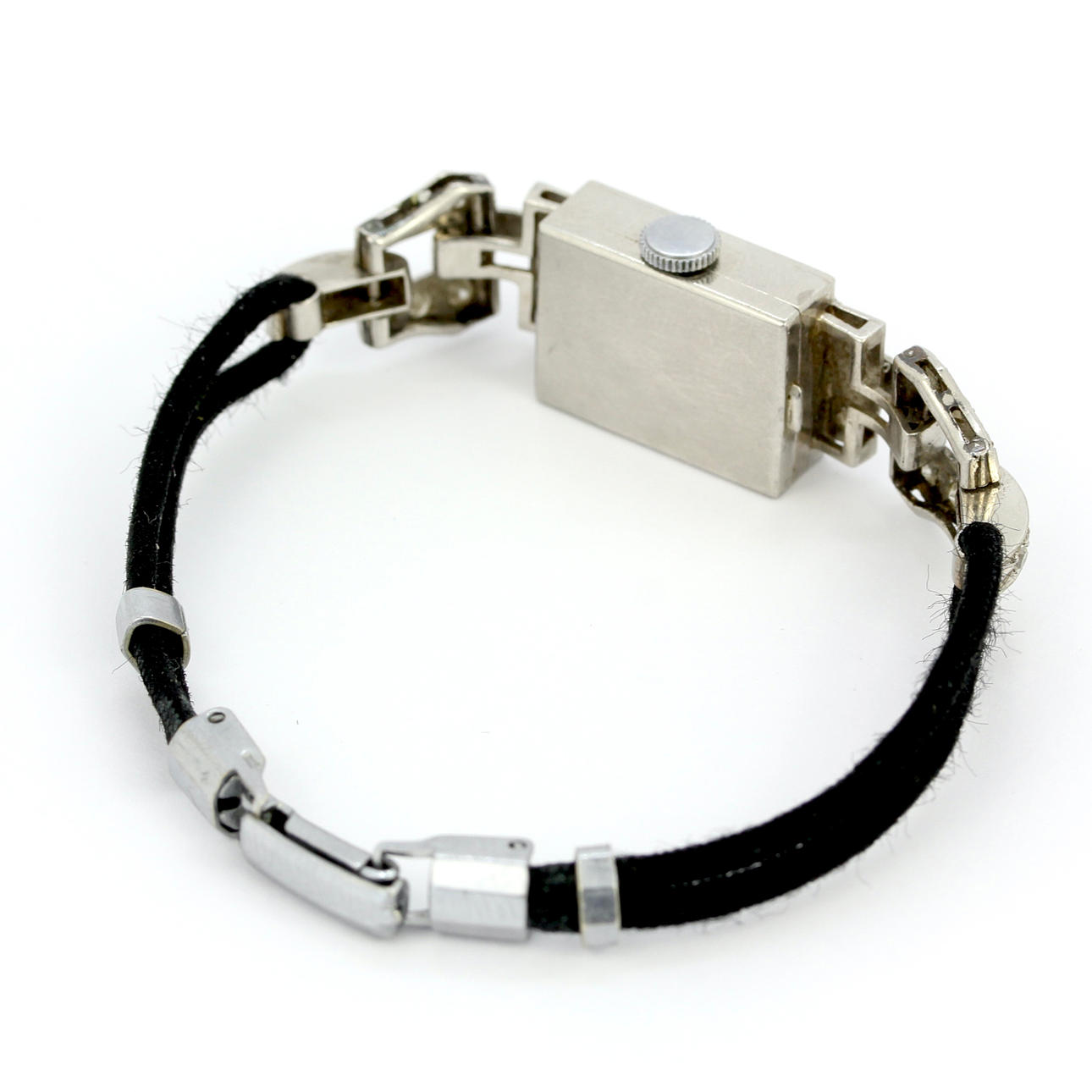 The signed square shape dial with arabic markers and outer minutes track, signed cal. A3A 17 jewel manual wind movement numbered 743 within an unmarked white metal case set with approx. 0.80ct single and baguette cut diamonds, to the cord sides and folding clasp, case diameter 14mm, gross weight 17.9g.