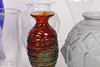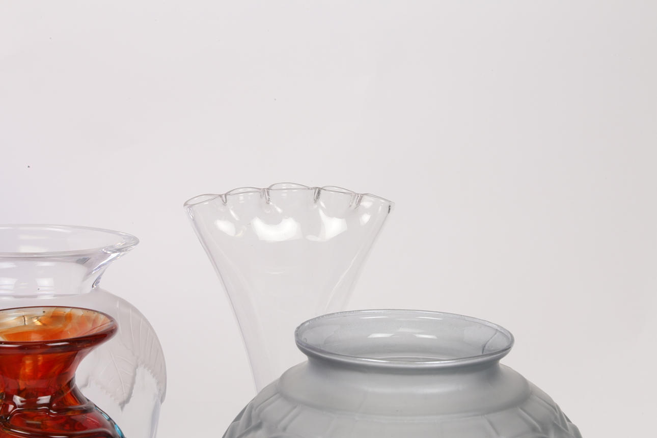 A selection of circa 1930s glass vases including an unusual clear glass vase with five individual openings, an English vase engraved with an interior of a cathedral, a glass vase by Mdina, a circa 1940 Czech orange speckled vase with brass grill cover, possibly Loetze, etc (8).