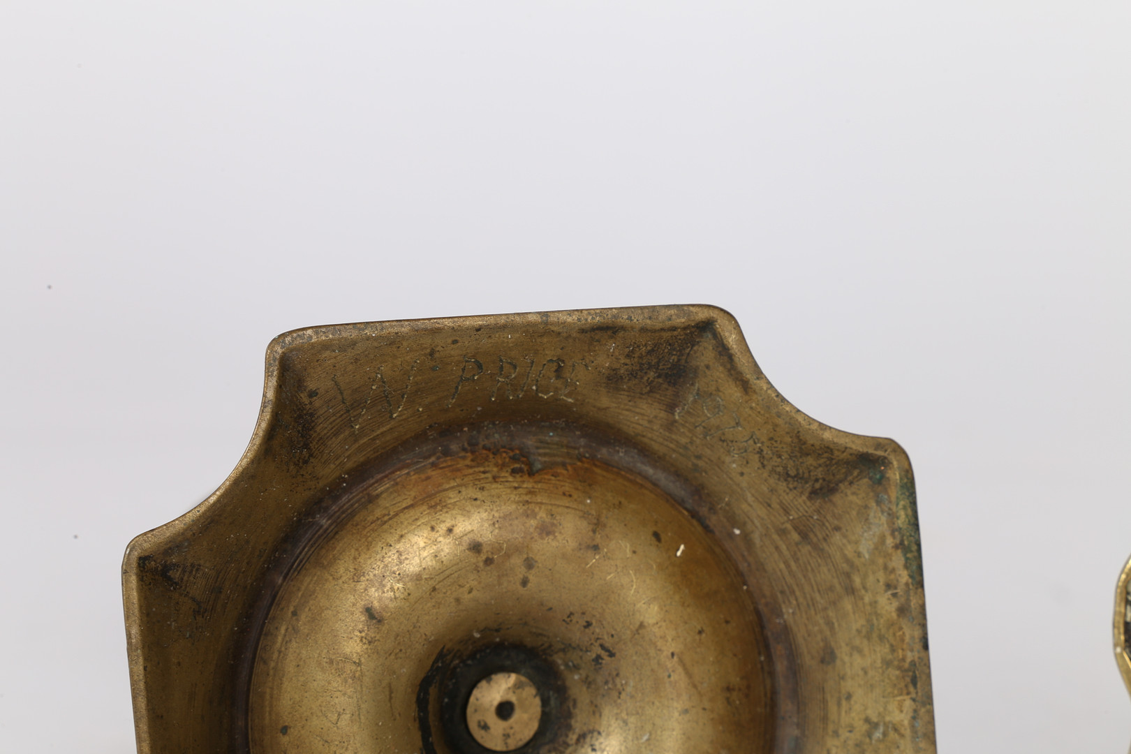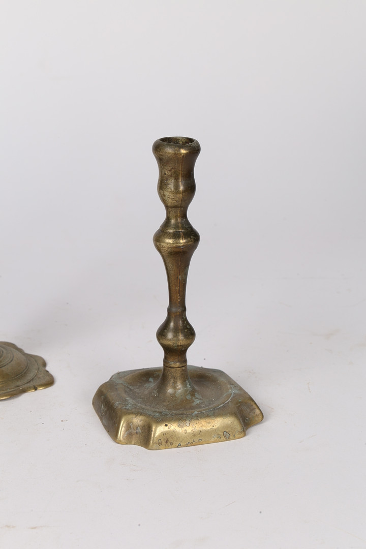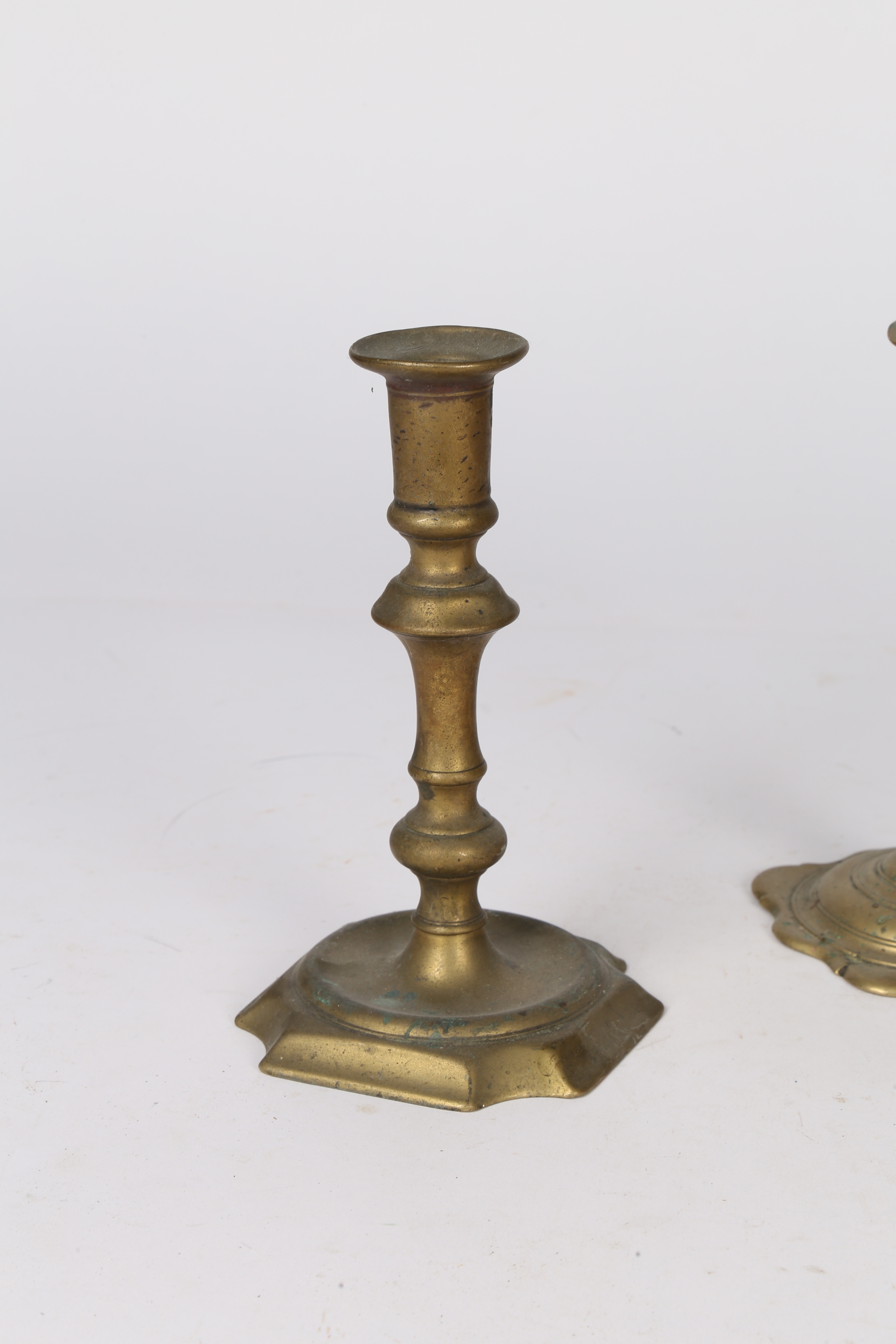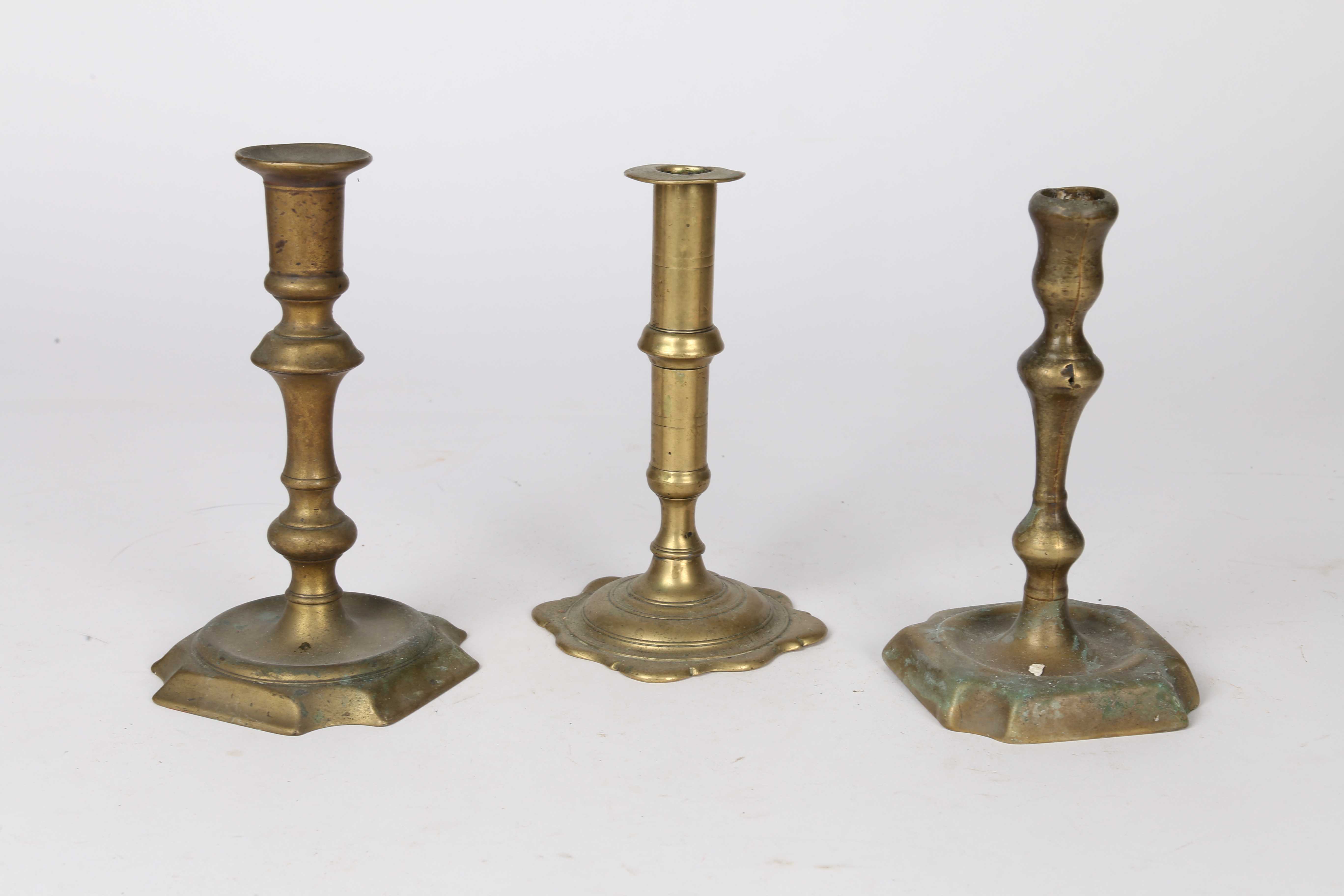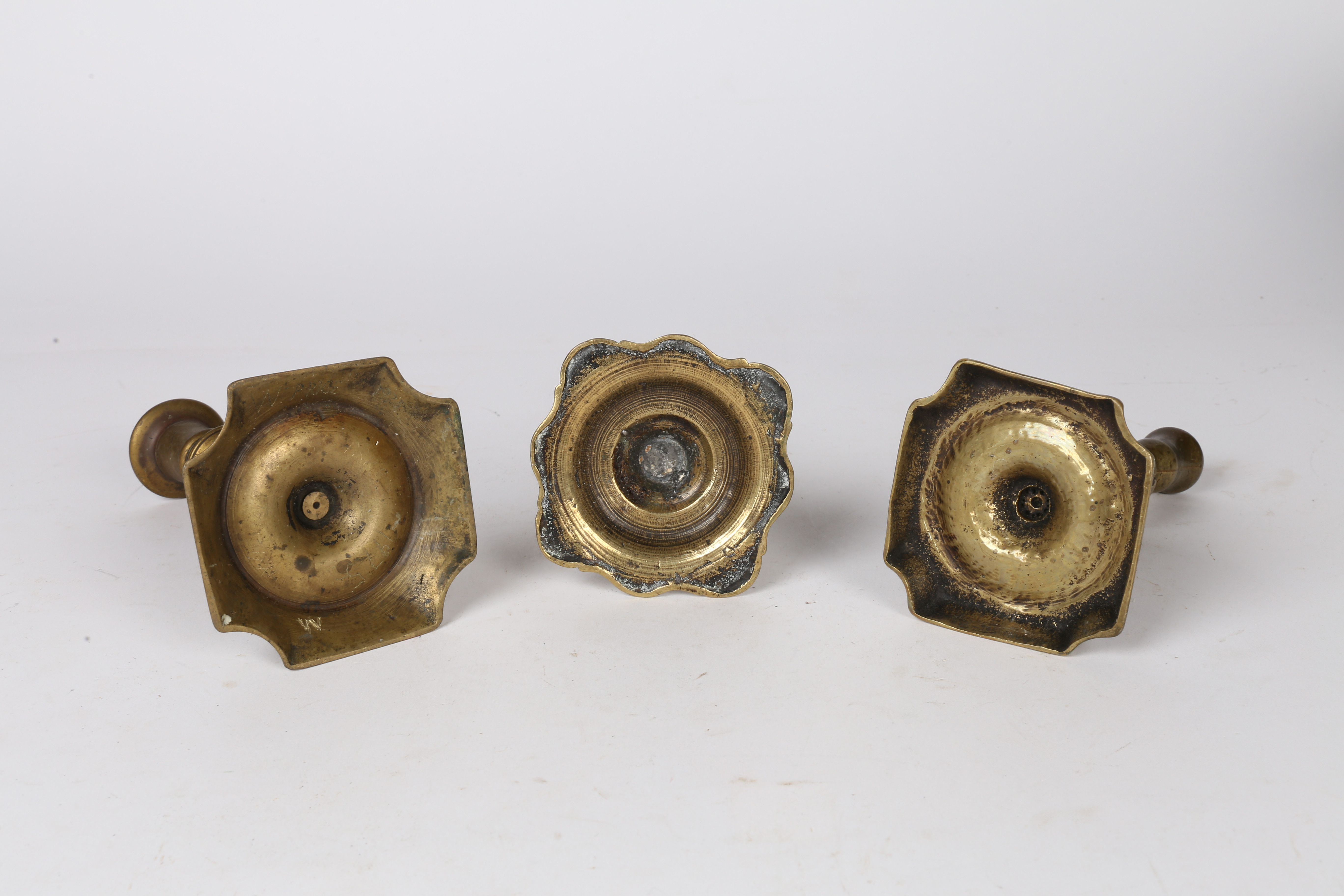 441. 3621973. THREE 18TH CENTURY BRASS CANDLESTICKS.