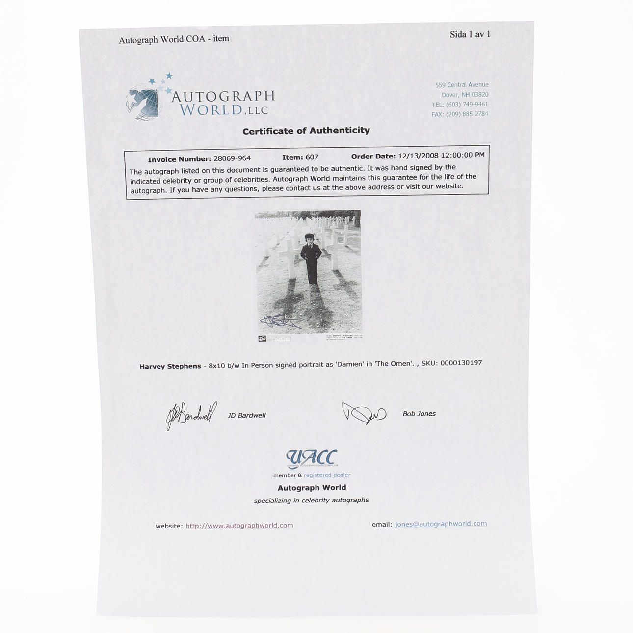 Autogrsf. Harvey Stephens is an English actor. He played the role of devil child Damien Thorn in the 1976 film The Omen, which earned him a Golden Globe nomination for Best Actor Debut in a Motion Picture - Male. Comes with COA from Autograph World, a very reputable company in the autograph industry. The autograph with purple ink on a black and white photo measuring approx. 25 cm. x 20.5 cm.