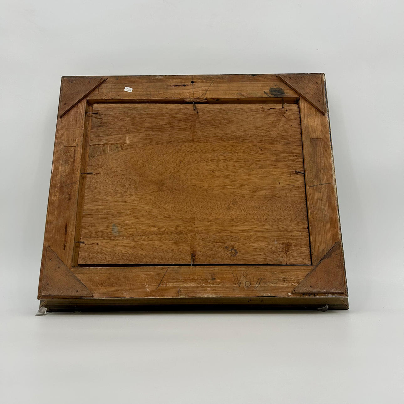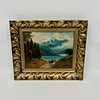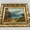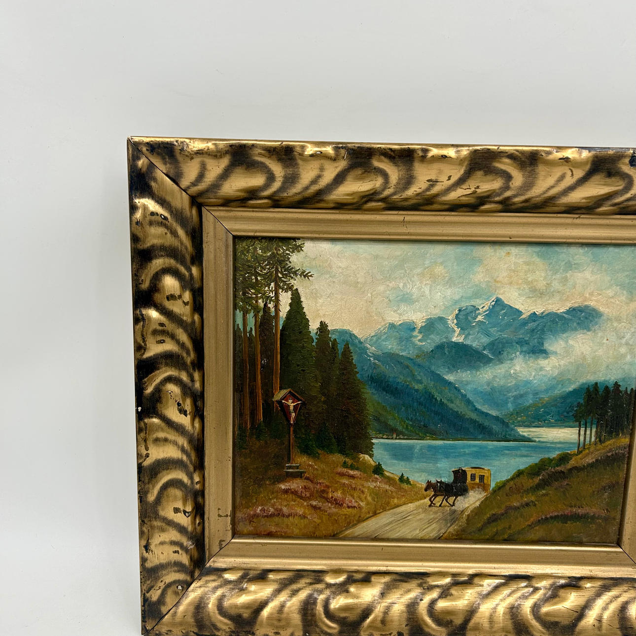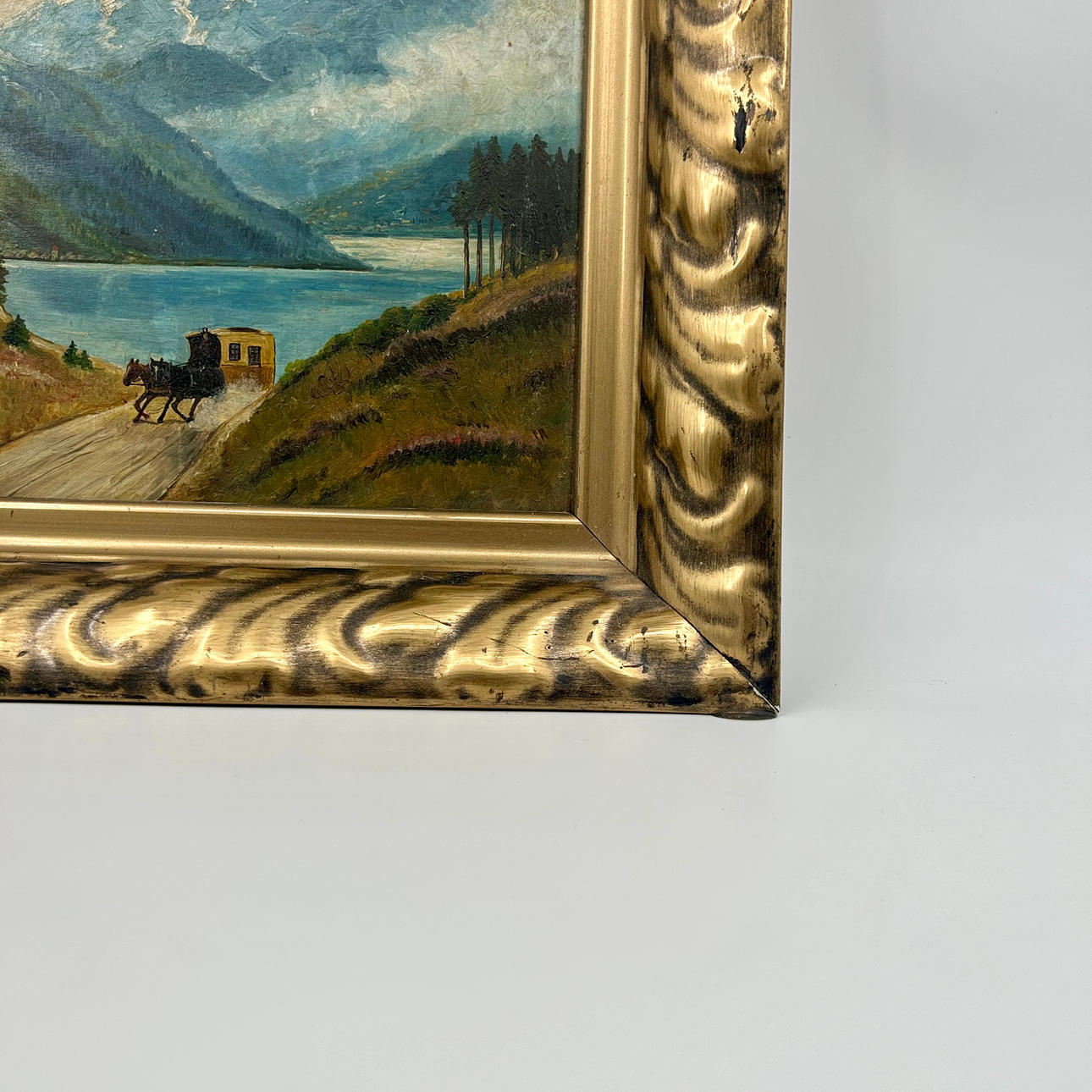 The painting shows a stagecoach ride through a landscape with a mountain lake. The artist is unknown.