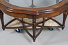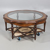the shaped circular top, with inset plate glass centre, on six turned tapered legs united by an interlaced star shape stretcher,