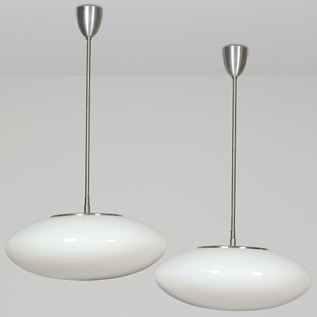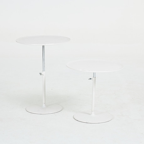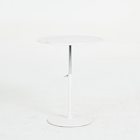 construction with a chrome-plated round steel base and an elliptically shaped plywood table top, coated white on the top, with manufacturer's label on the underside,