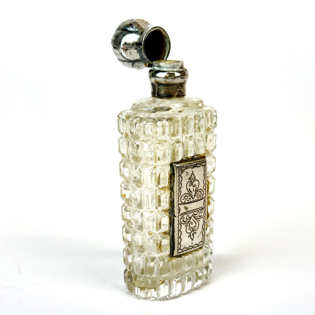 An antique French silver mounted perfume bottle, H. 9cm.