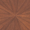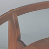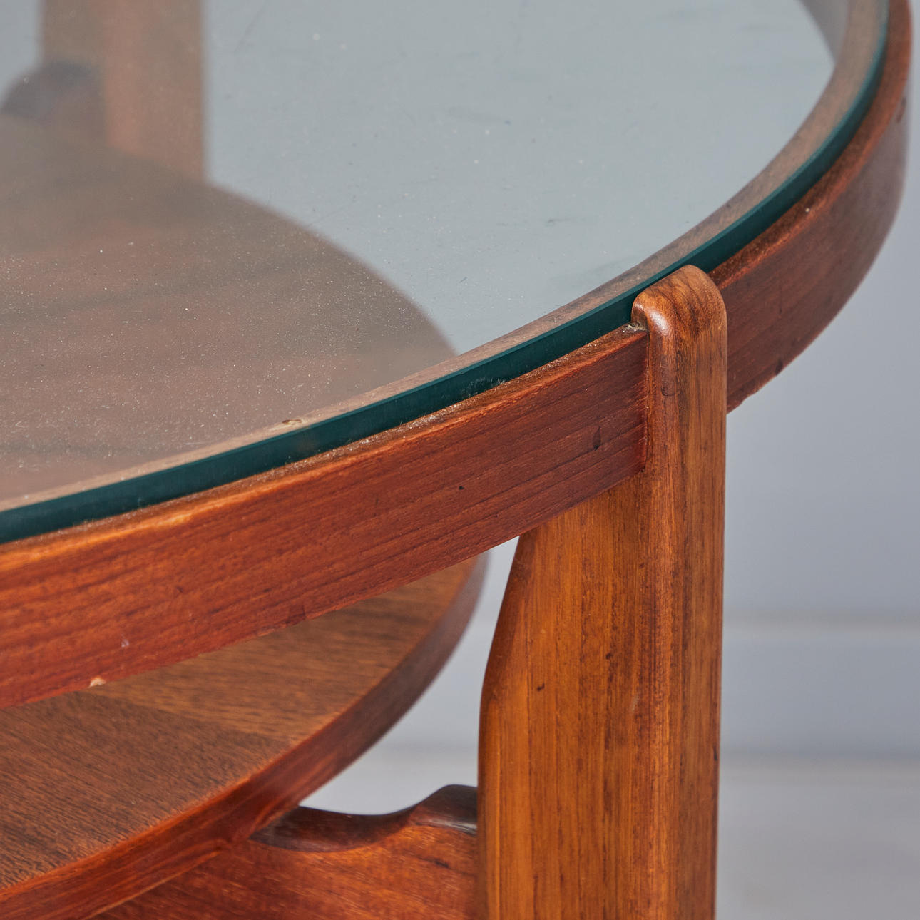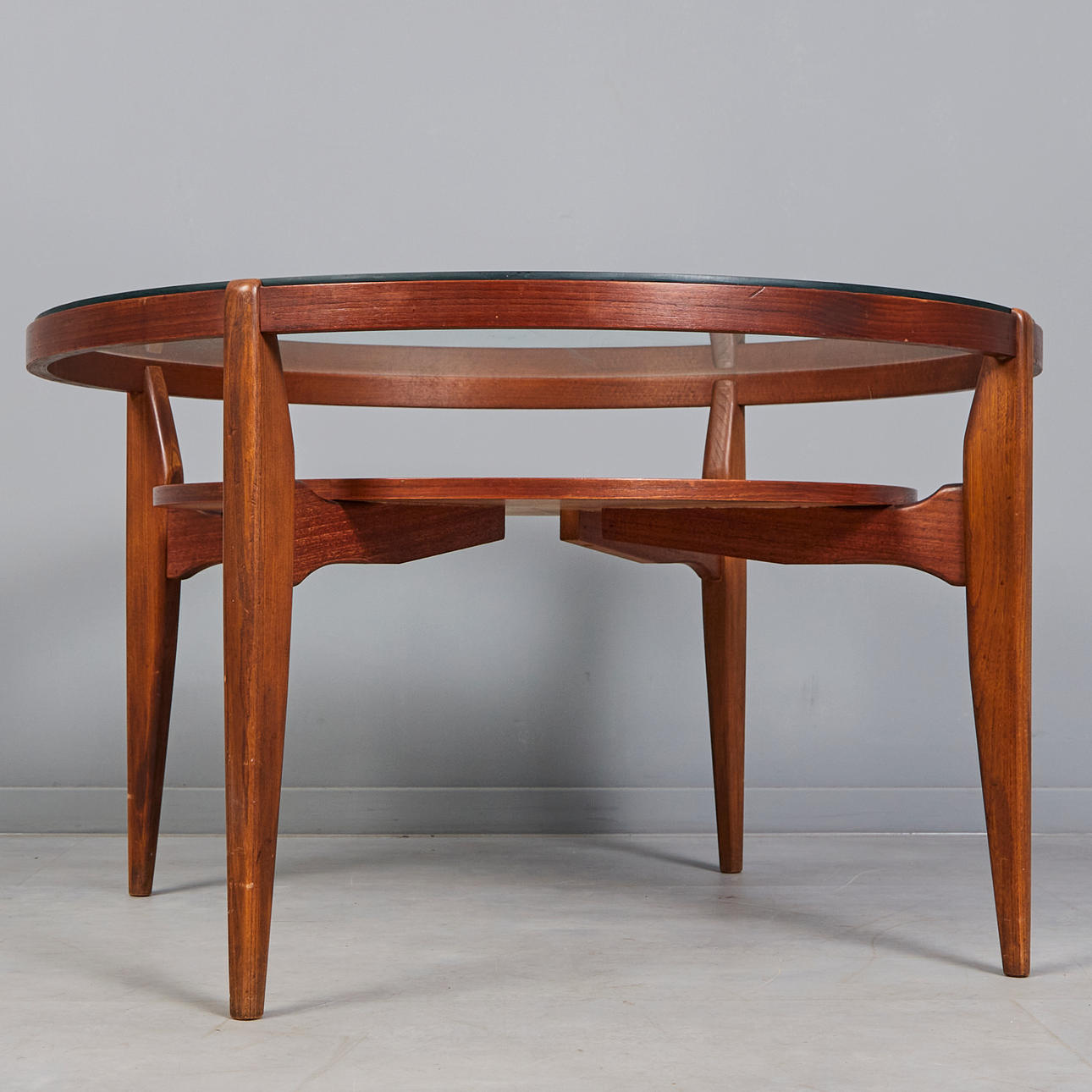 Glazed walnut veneer construction with four braced legs and a loosely placed, round glass table top, h.54cm, d.90cm.