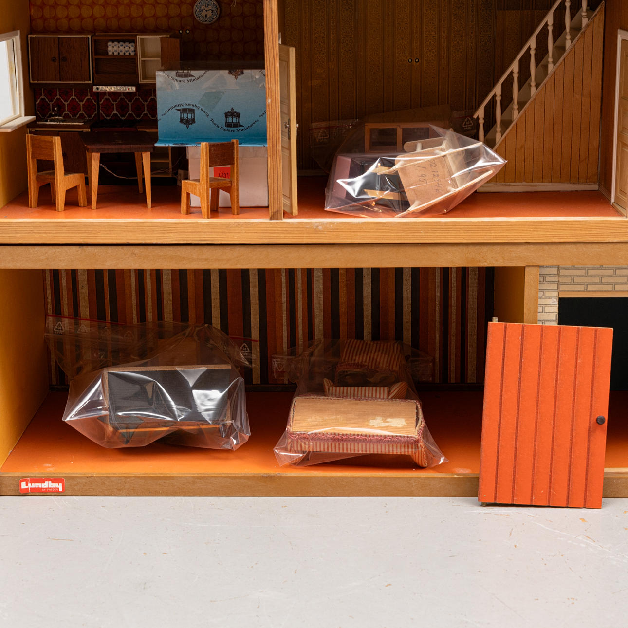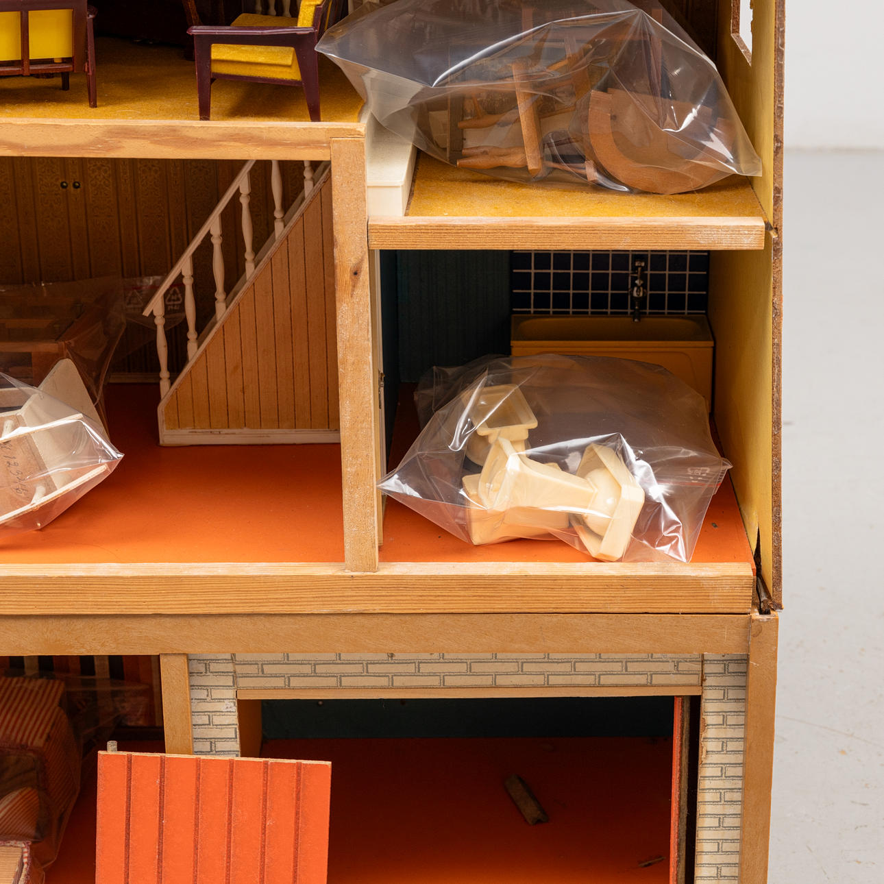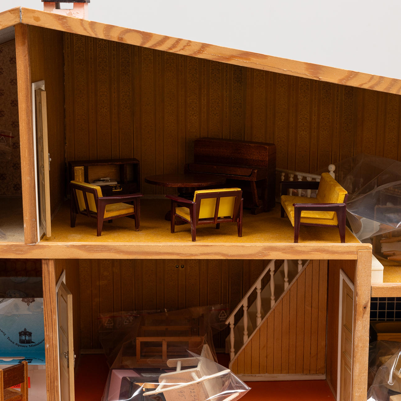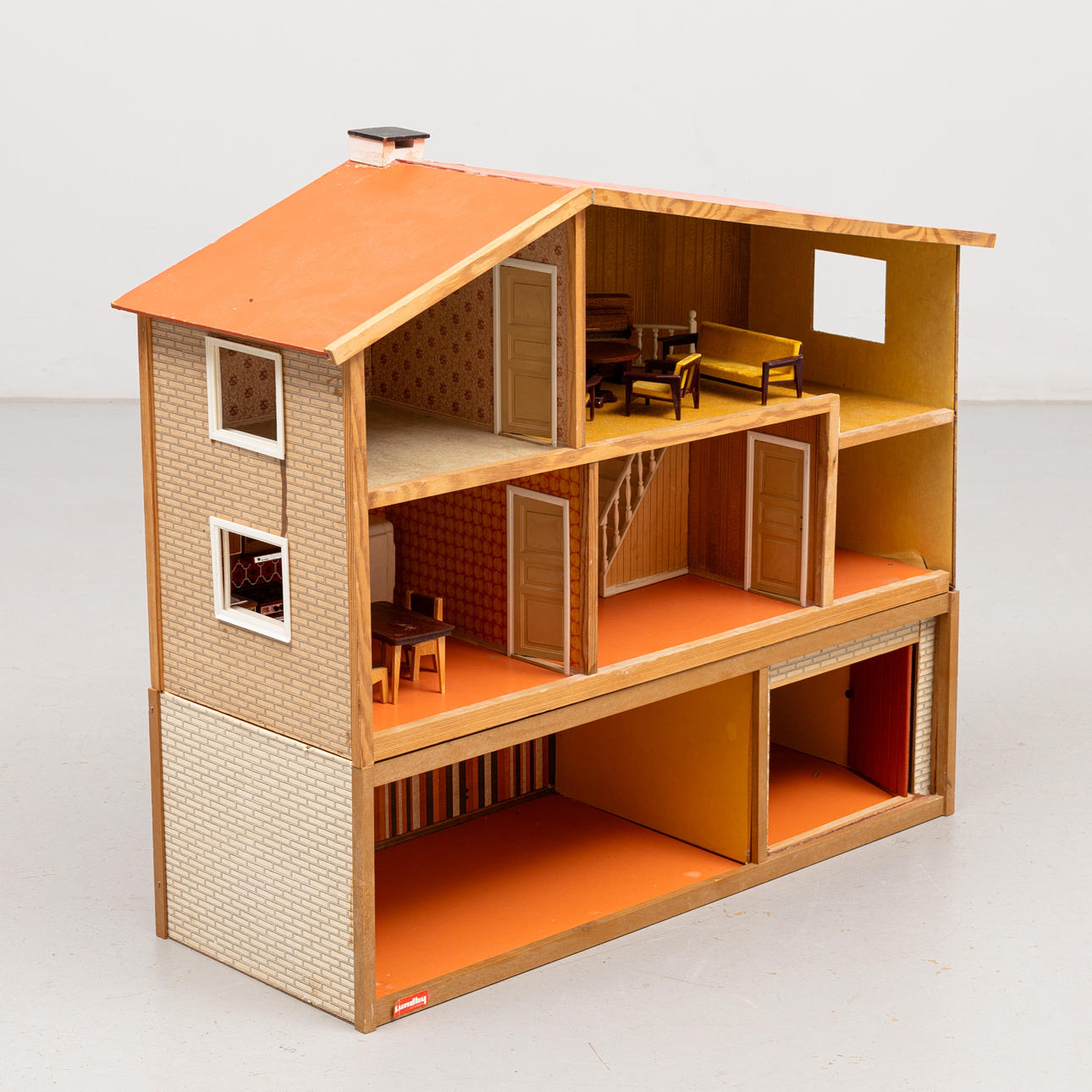 Dollhouse in two modules, 3 furnishable floors, 7 rooms + garange, facade of red and white brick, furniture and interior details. Preparation for electricity is available.