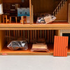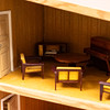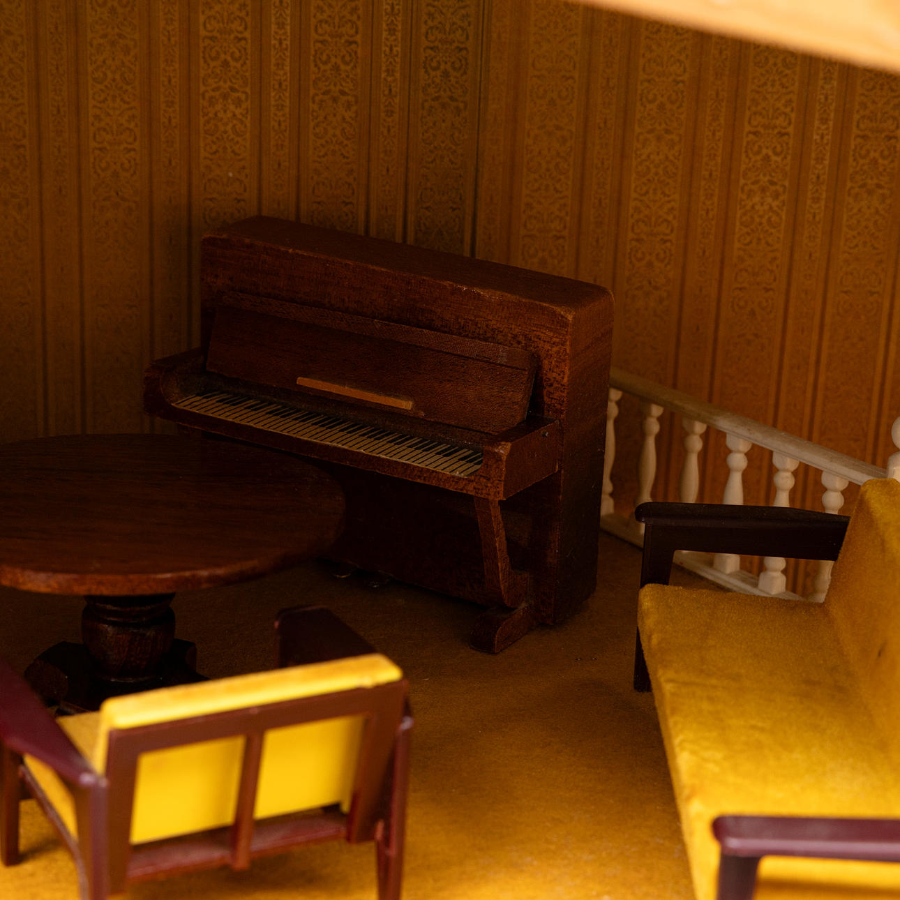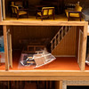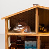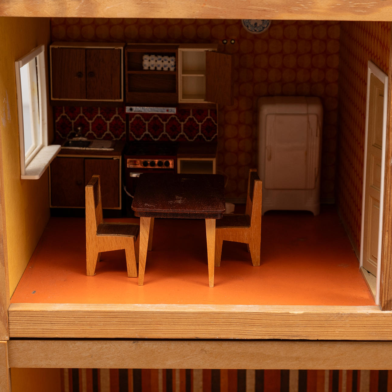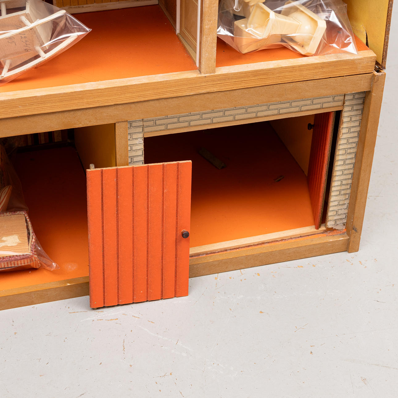 Dollhouse in two modules, 3 furnishable floors, 7 rooms + garange, facade of red and white brick, furniture and interior details. Preparation for electricity is available.