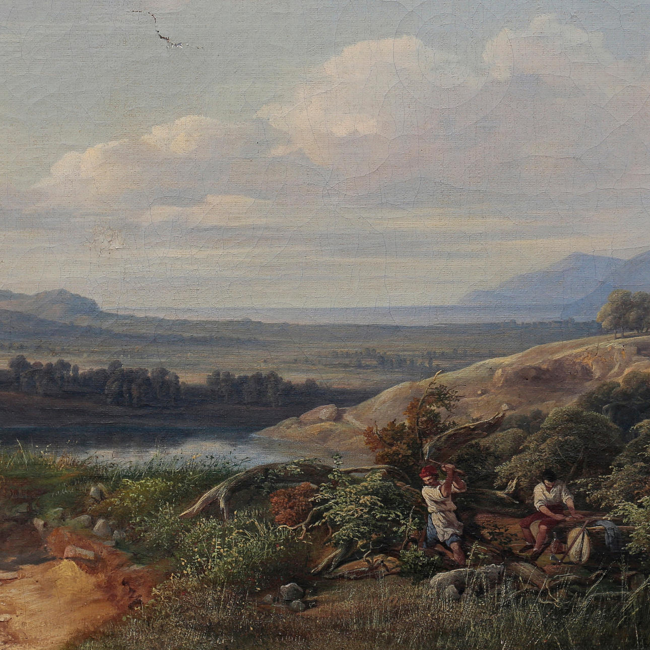 Patches on the back and two tears of the fabric. Period frame in gilt wood.