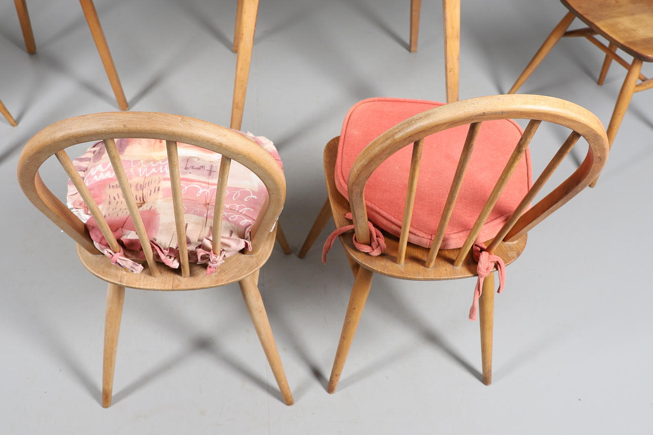 the light elm table of rounded rectangular form, on tapering legs together with a darker extendable attachment and four stick-back chairs; the table 136.5cm L x 75cm W x 71cm H (6).