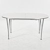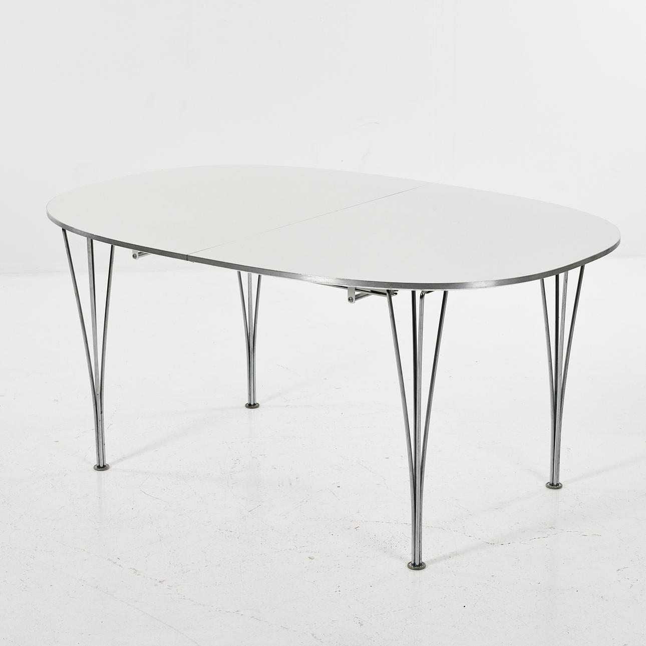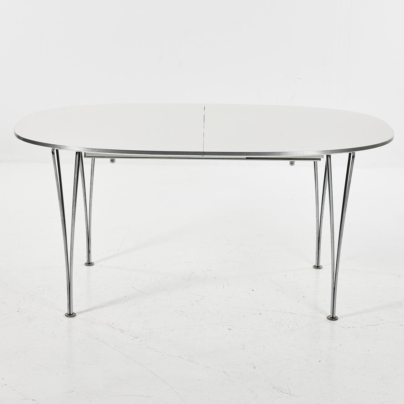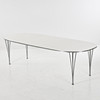 3652298. BRUNO MATHSSON & PIET HEIN. Dining table, “Superellips B618", white plastic laminate top, sash and removable legs in chrome.