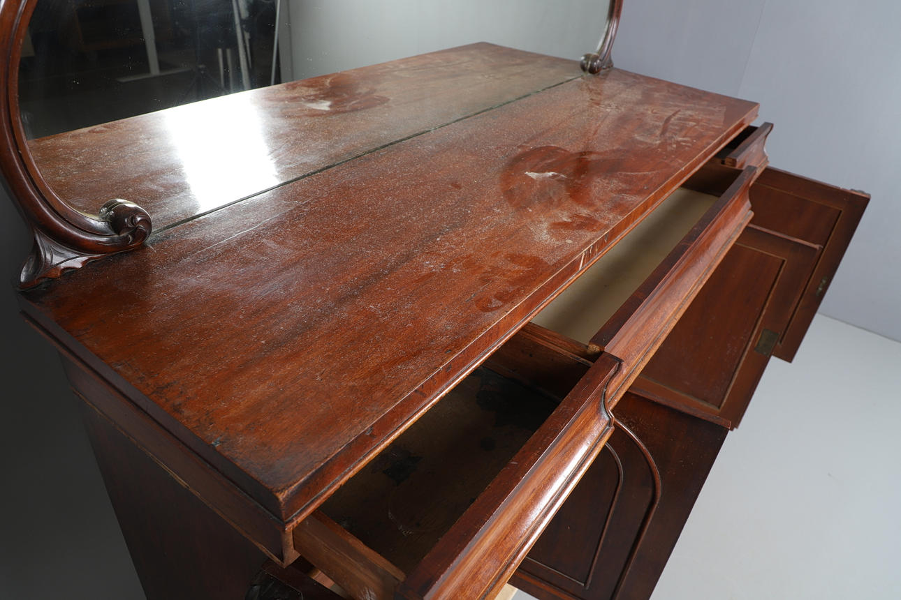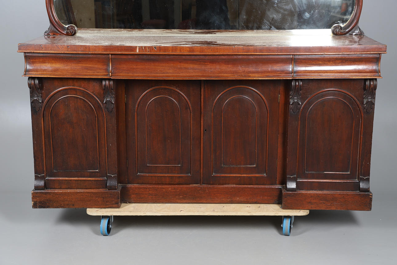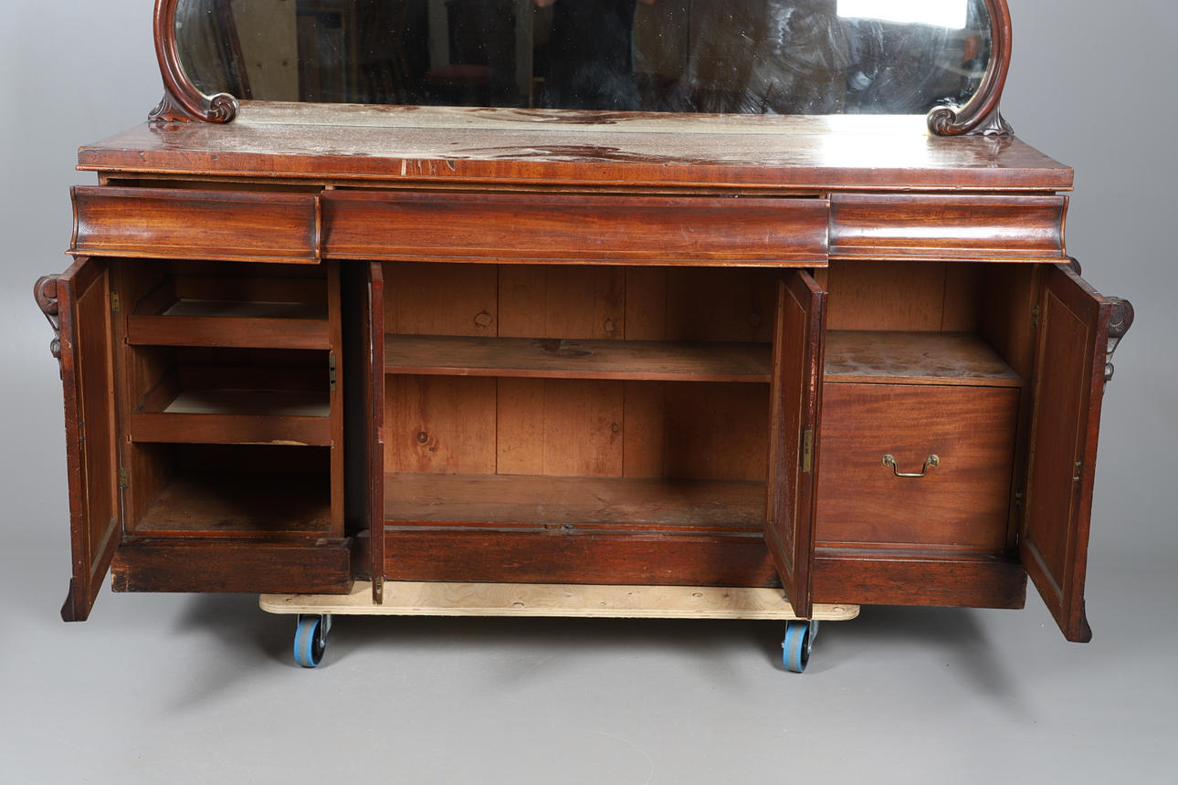 The shaped mirror back over three frieze drawers with cupboards under. 163cm high x 183cm wide x 53cm deep.
