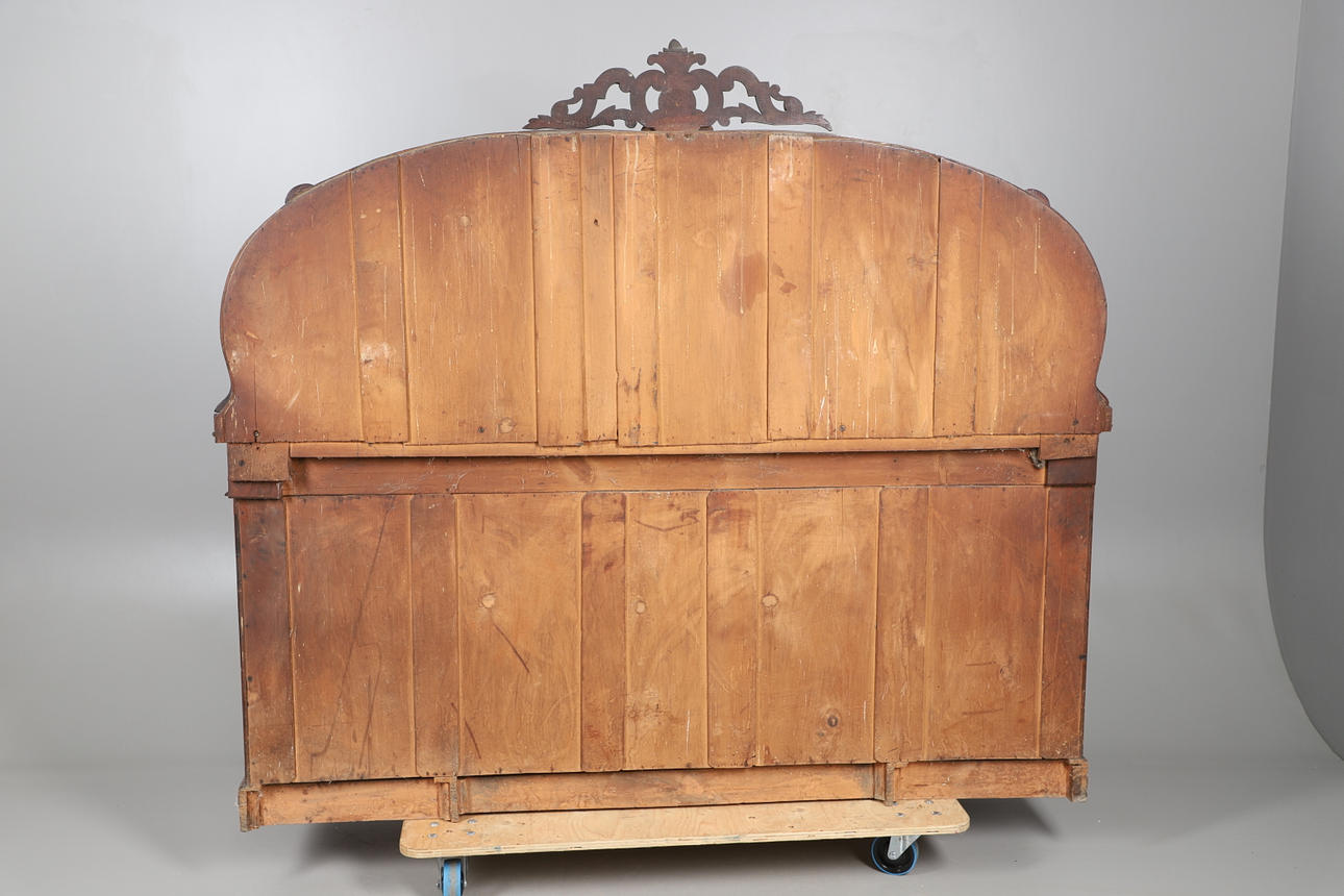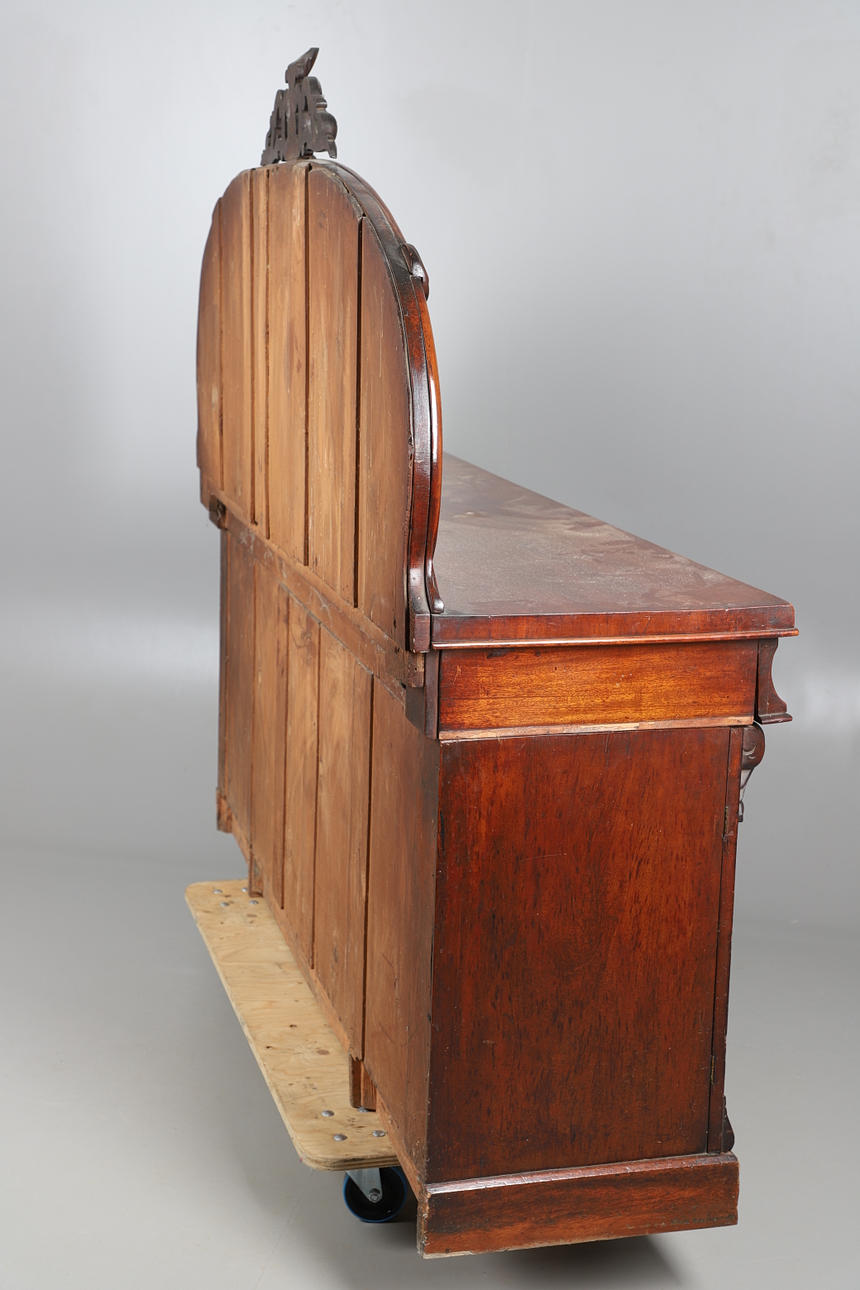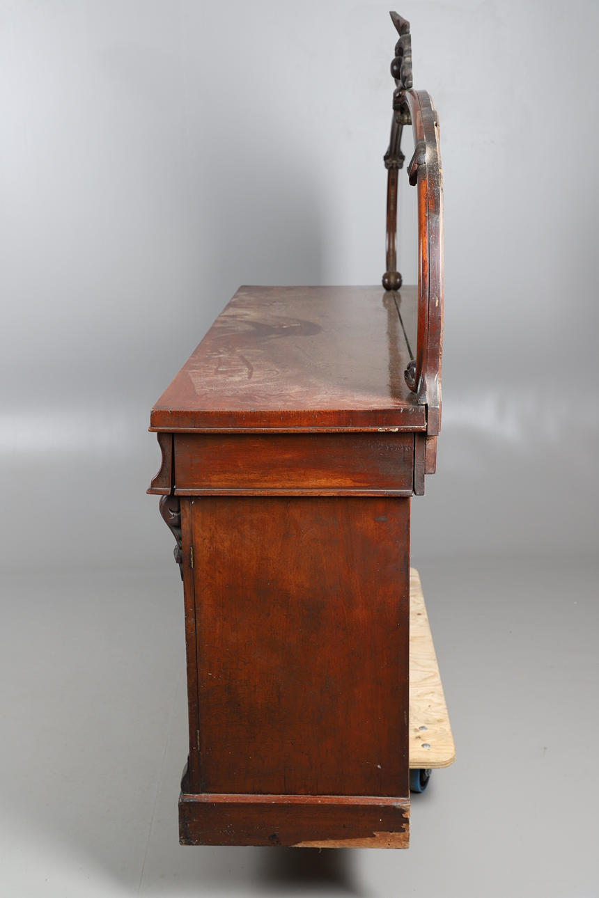 The shaped mirror back over three frieze drawers with cupboards under. 163cm high x 183cm wide x 53cm deep.