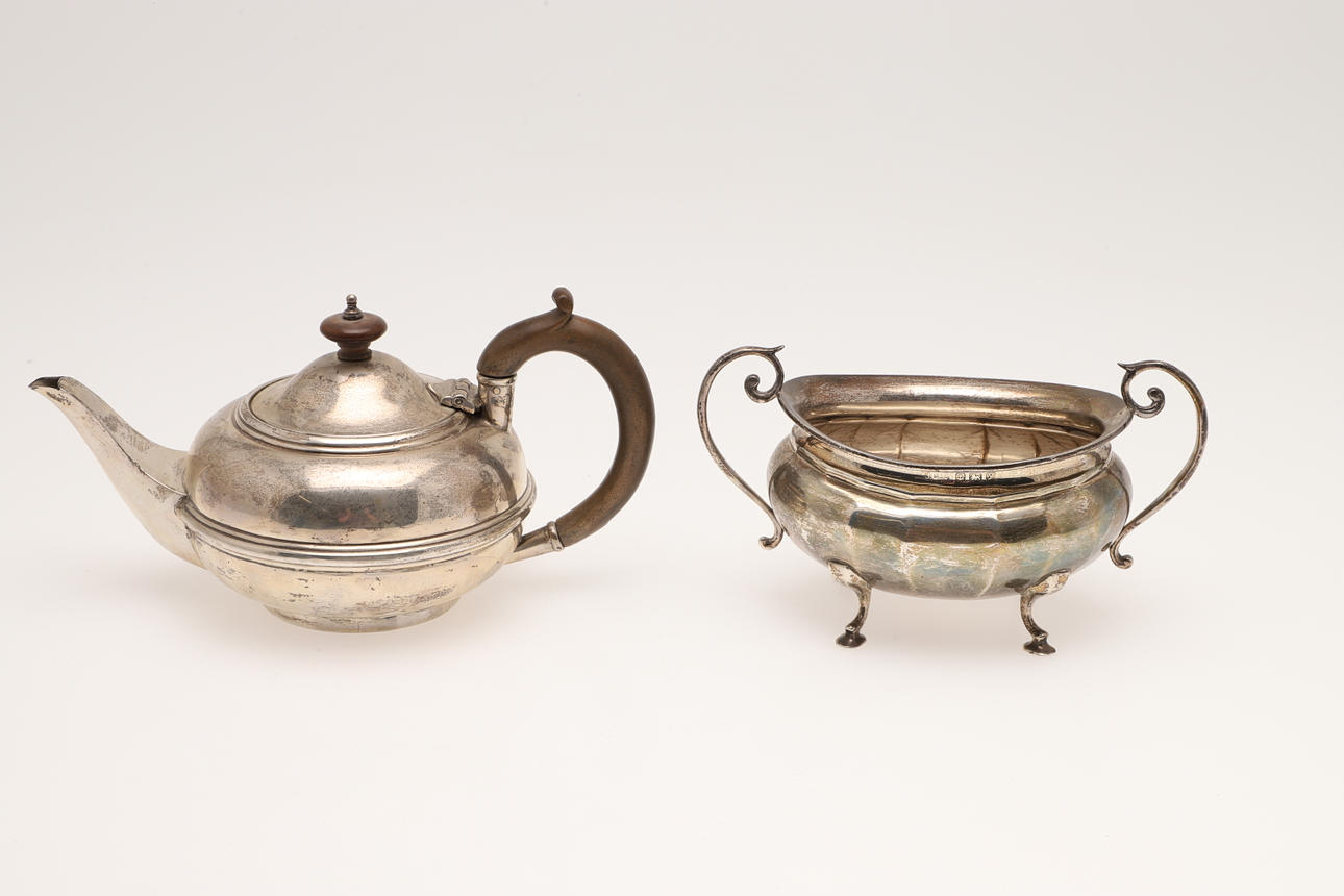 by two different makers; the tea pot 8.5 " (21.5cm) long; 14.6ozt (2).